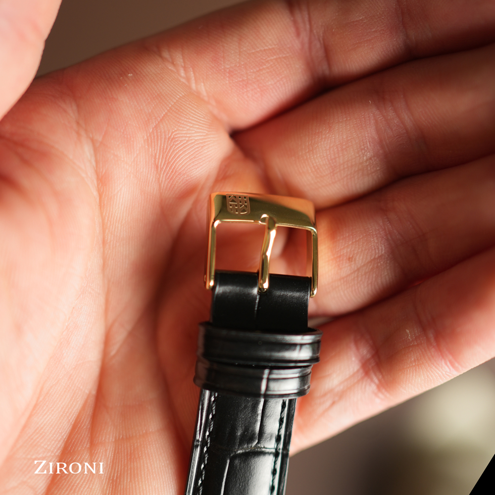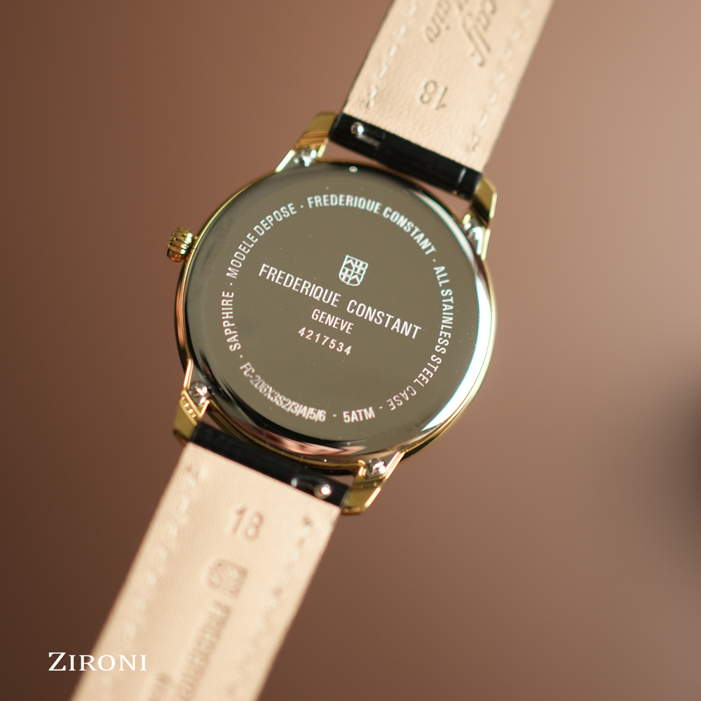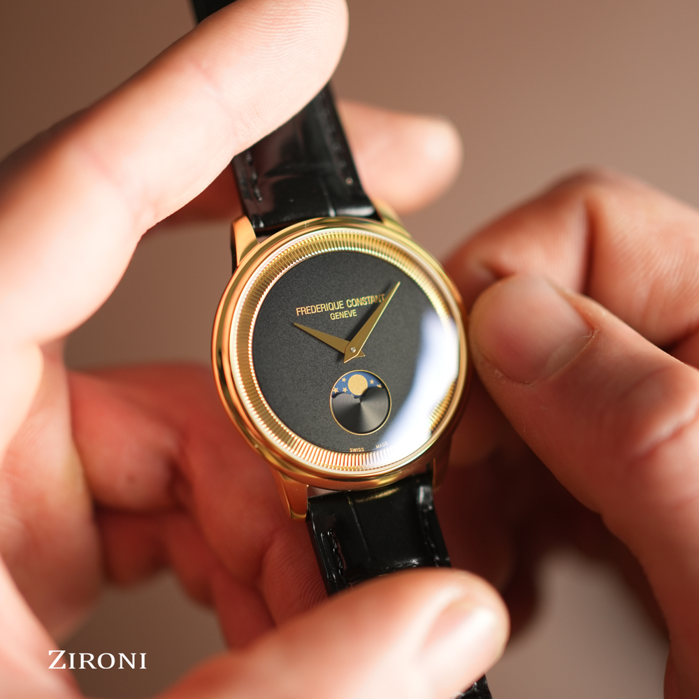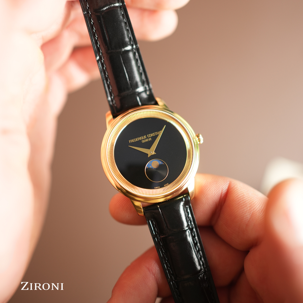 Un modello da 37 mm rivestito in PVD oro giallo lucido. La sua cassa sottile 7,65 mm incornicia un quadrante nero opaco, il cui anello interno scolpito, modellato come il bordo di una moneta, gli conferisce un carattere unico. Seguendo le lancette color oro, la luna rivela il suo ciclo alle ore 6, infondendo al tempo una poesia perpetua. Protetto da un vetro zaffiro convesso, questo segnatempo ospita un calibro al quarzo FC-206 di grande affidabilità (autonomia di 60 mesi). Un elegante cinturino in pelle di vitello nera con motivo coccodrillo completa questo classico capolavoro.