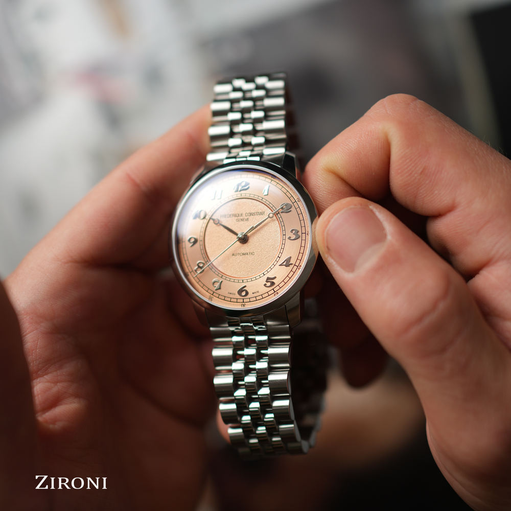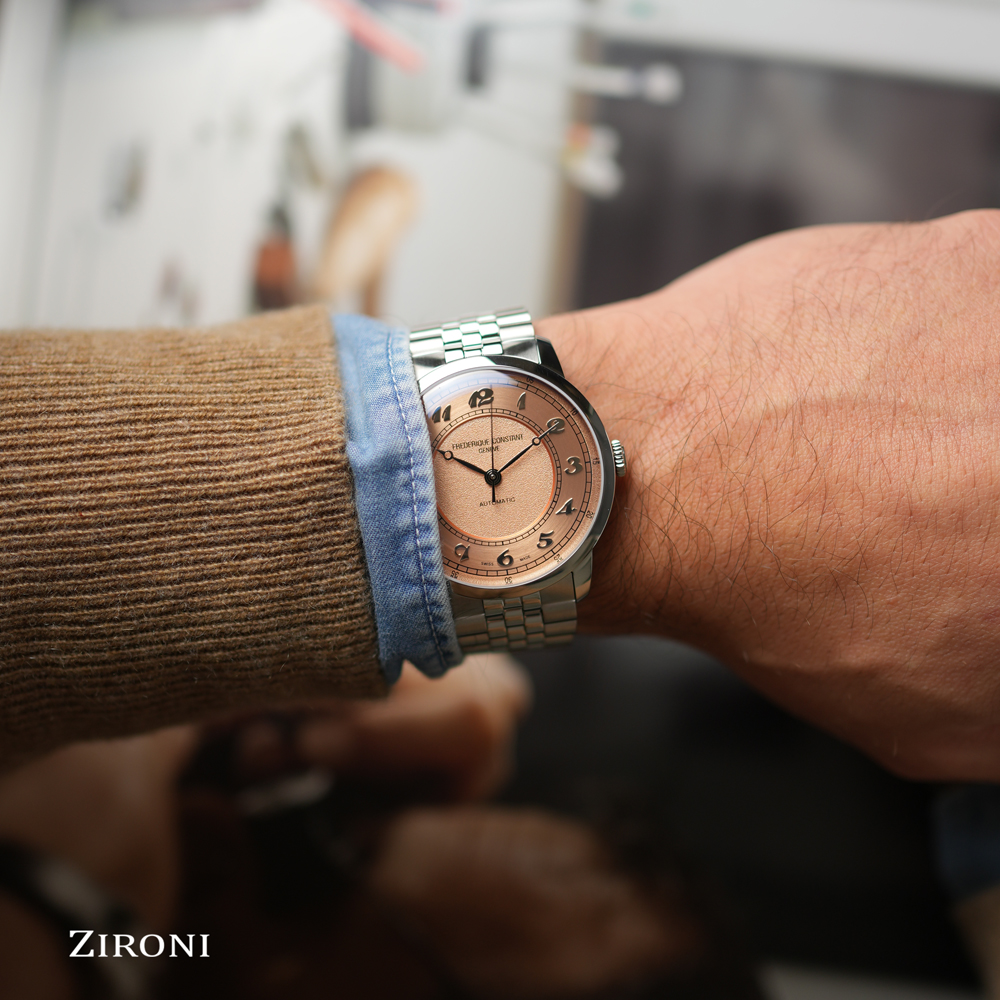 Il Classics Premiere in salmone è molto più di un semplice orologio: è un vibrante omaggio ai codici estetici degli anni ’50 e ’60, rivisitati in chiave moderna. Il suo quadrante, di una delicata tonalità salmone, è particolarmente apprezzato dai collezionisti per la sua raffinatezza discreta e il suo carattere unico. Gli indici in numeri arabi e le lancette svuotate evocano il fascino dei segnatempo vintage, mentre la minuteria “ferroviaria” e il quadrante settoriale richiamano l’eleganza senza tempo dell’Art Déco. Al centro, una delicata finitura granulata si armonizza con un cerchio soleil, creando un gioco di luci e texture che esalta il savoir-faire del marchio. Più moderno rispetto alla versione con cinturino in pelle, questo modello presenta un bracciale in acciaio a cinque maglie, progettato per un comfort ottimale. Con la sua cassa da 38,5 mm perfettamente unisex e il suo movimento automatico Swiss Made, questo orologio è l’alleato ideale dell’uomo e della donna moderni, che unisce un’estetica classica al comfort urbano. È la scelta preferita dagli appassionati di orologi vintage e dai collezionisti che desiderano un pezzo elegante e versatile per l’uso quotidiano.