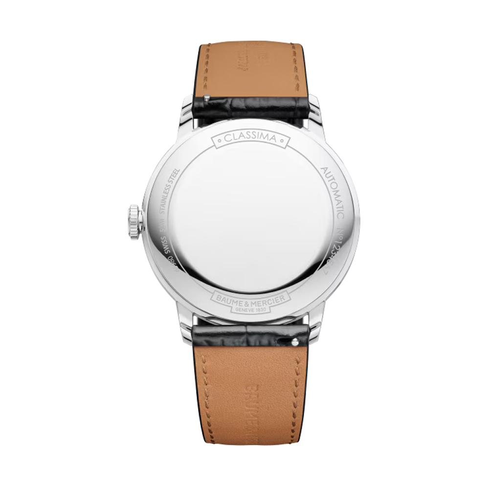 Il Classima 10874 si distingue per la cassa rotonda in acciaio lucido da 40 mm, espressione di eleganza senza tempo. La corona e il fondello chiuso, anch’essi in acciaio lucido, completano il segnatempo con discrezione. Il quadrante opalino bianco argentato valorizza i numeri romani e gli indici neri, insieme alle lancette a foglia in rutenio, per un’estetica raffinata e armoniosa. A ore 3 si inserisce il datario, che completa l’insieme con equilibrio. Animato da un movimento automatico (Sellita SW200), offre una riserva di carica di 38 ore e un’impermeabilità fino a 5 ATM. Il cinturino intercambiabile in pelle di vitello nera con motivo alligatore è dotato di un sistema pratico e affidabile che ne consente la sostituzione senza l’uso di strumenti.