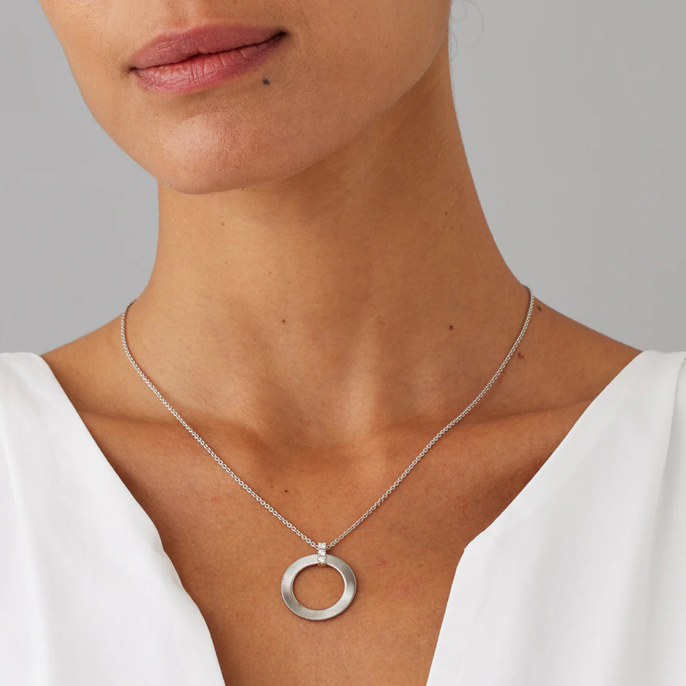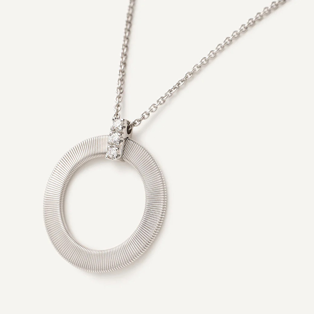 Un elemento circolare in filo di spirale piatta, realizzata grazie all’esclusiva lavorazione artigianale del coil caratterizza questo pendente in oro bianco 18kt, con catena regolabile. Sofisticato e dal design lineare, è impreziosito da una contromaglia di diamanti taglio brillante. Versatile ed elegante, è perfetto da indossare ogni giorno.