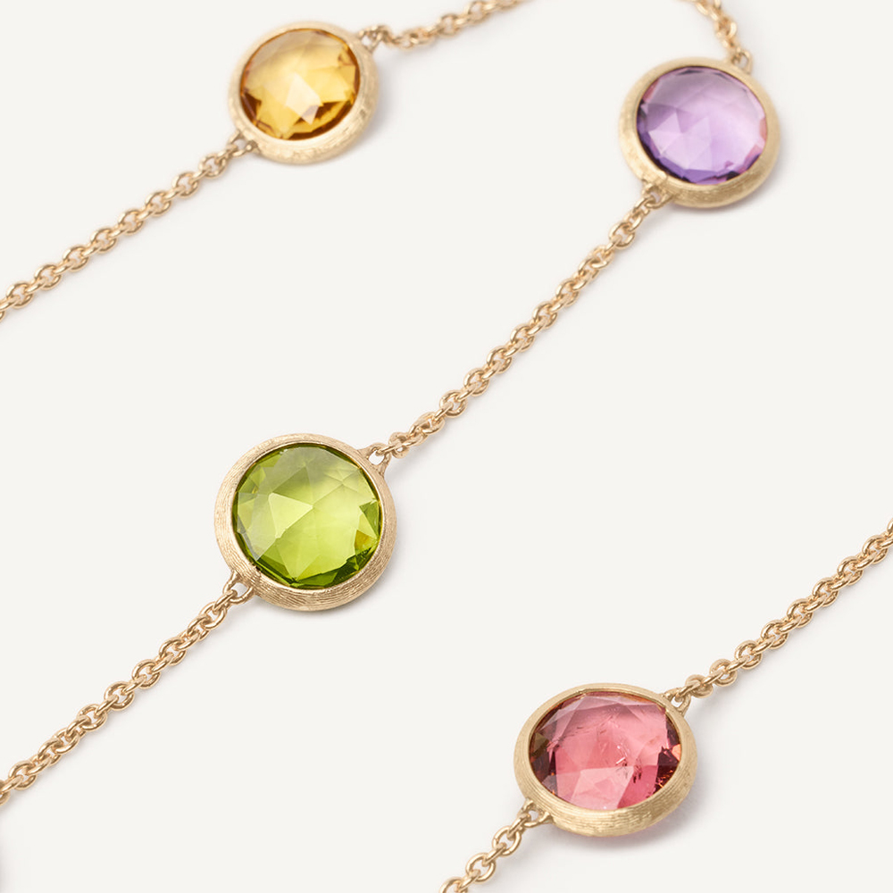 Leggera, chic, montata su una finissima catena regolabile e perfetta da indossare tutti i giorni: un degradé di gemme multicolore accuratamente selezionate per intensità e purezza e impreziosite da una ghiera in oro giallo 18kt, finemente incisa a mano con l'antica tecnica del bulino millerighe.