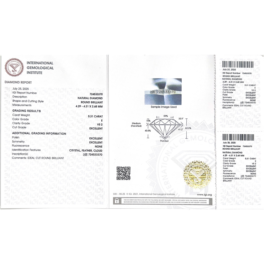 La certificazione riporta le famose 4C (Carat, Color, Clarity, Cut), offrendo massima trasparenza all’acquirente.