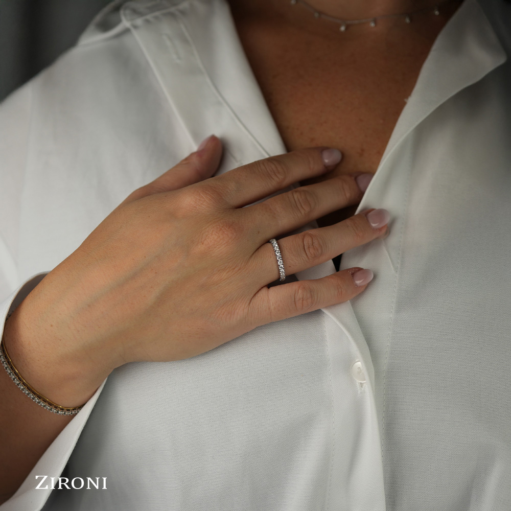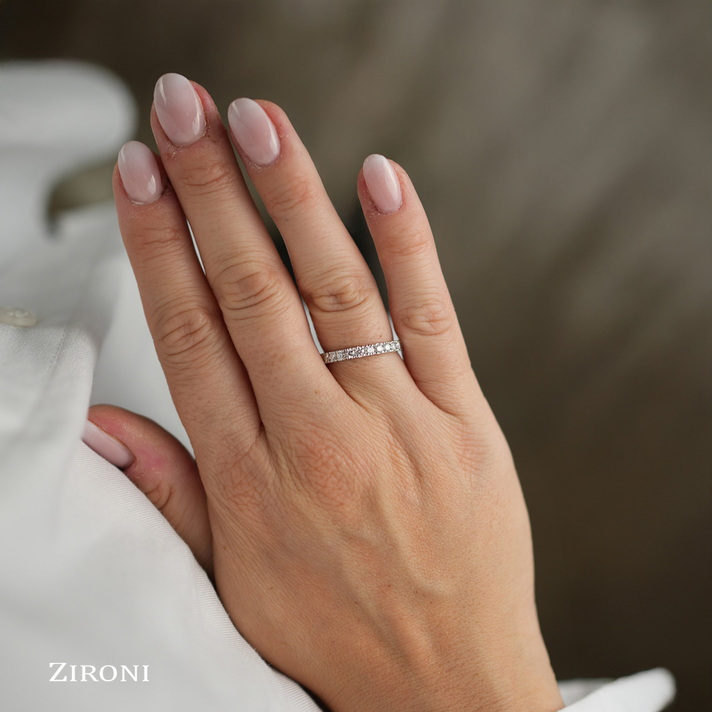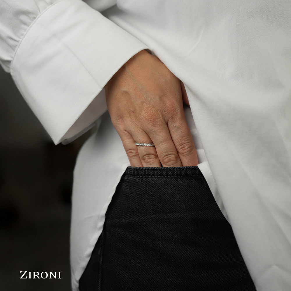 I 15 diamanti taglio brillante da 0,03 ct (D/E - SI) sono stati scelti e calibrati con estrema precisione, così la montatura risulta perfettamente regolare, comoda e più facile da mantenere pulita.