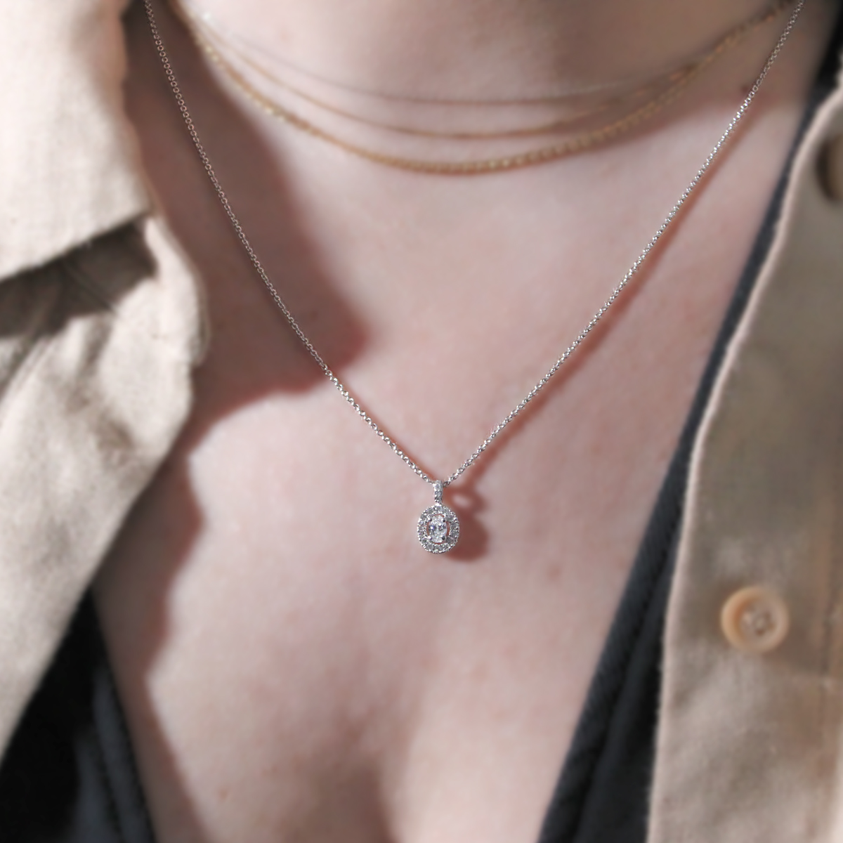 Girocollo in oro bianco 18 ct con diamante centrale taglio ovale (0,20 ct) e contorno di diamanti taglio brillante (0,13 ct)