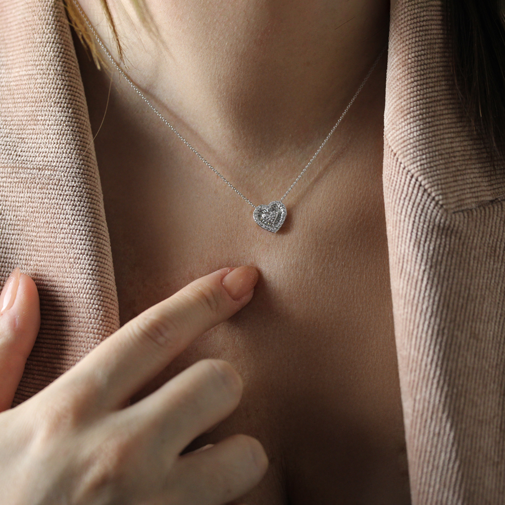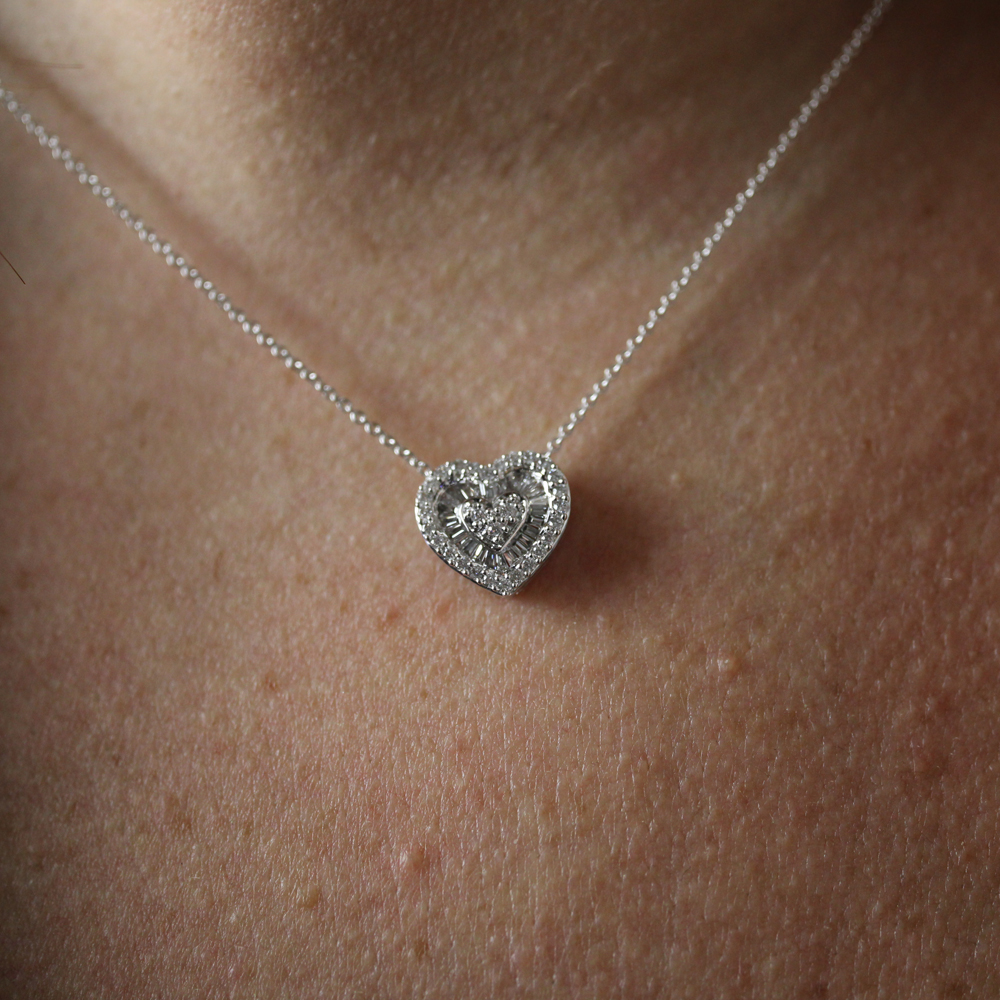 Girocollo in oro bianco 18K con cuore centrale con diamanti taglio baguettes e taglio brillante (ct 0.50 - G - SI) - lunghezza 42 cm