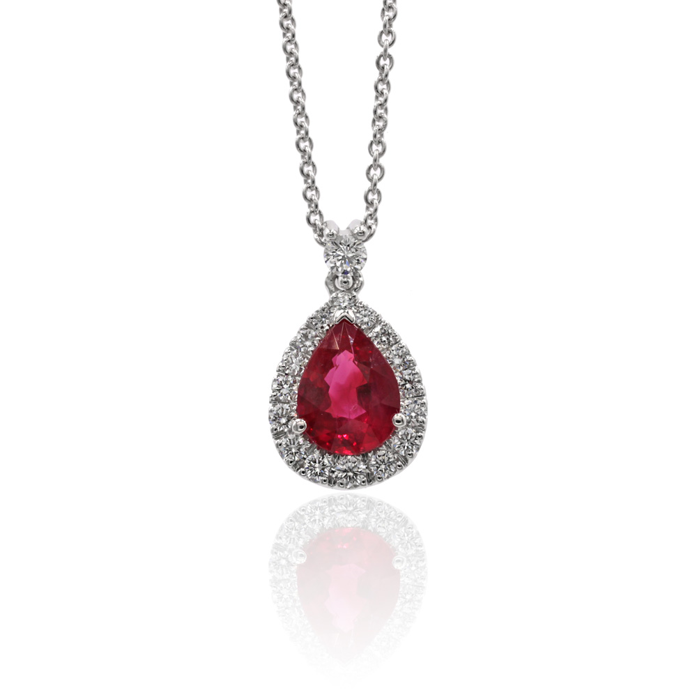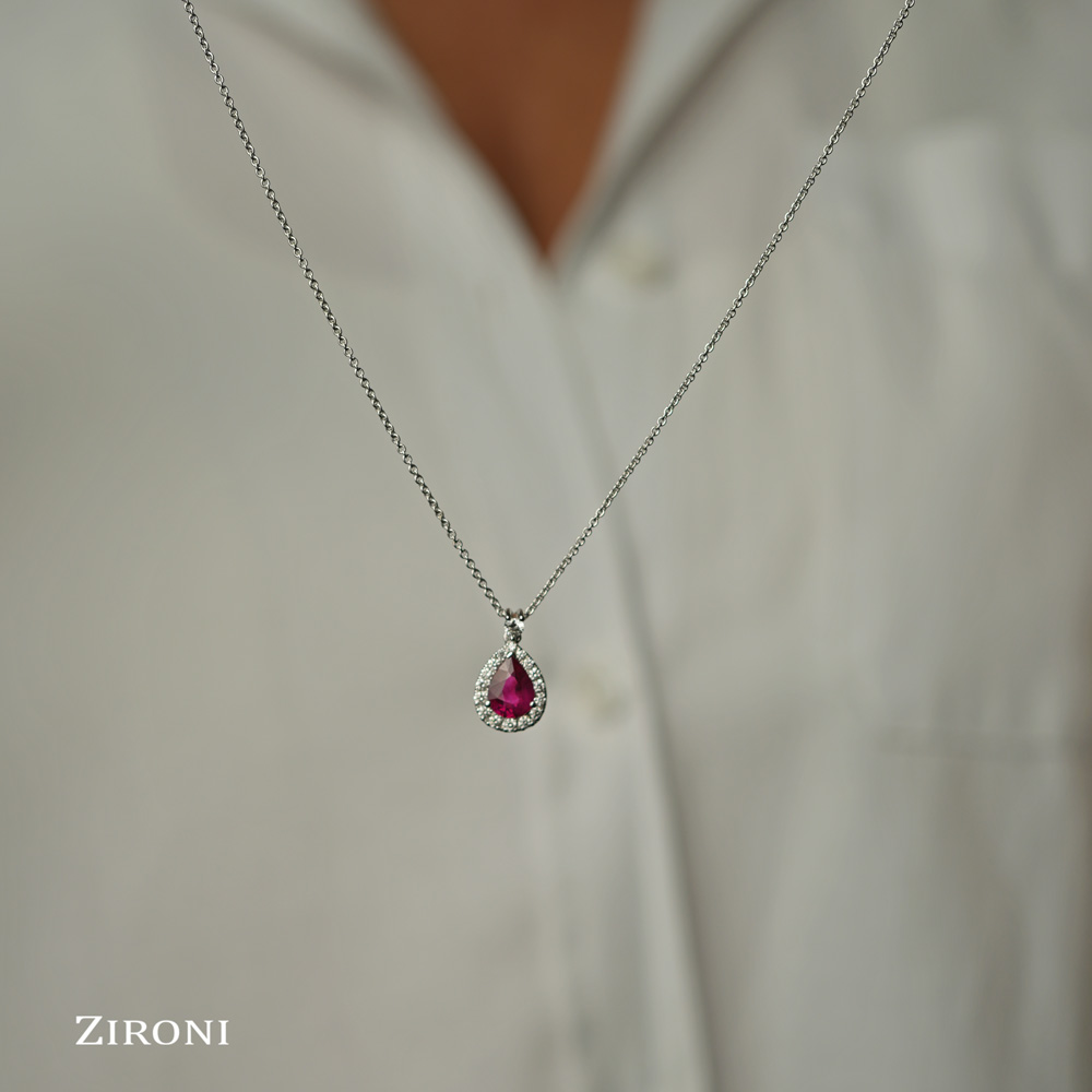 Girocollo in oro bianco 18K con diamanti taglio brillante (ct 0,29 - G - VS) e rubino taglio goccia (ct 1,20)