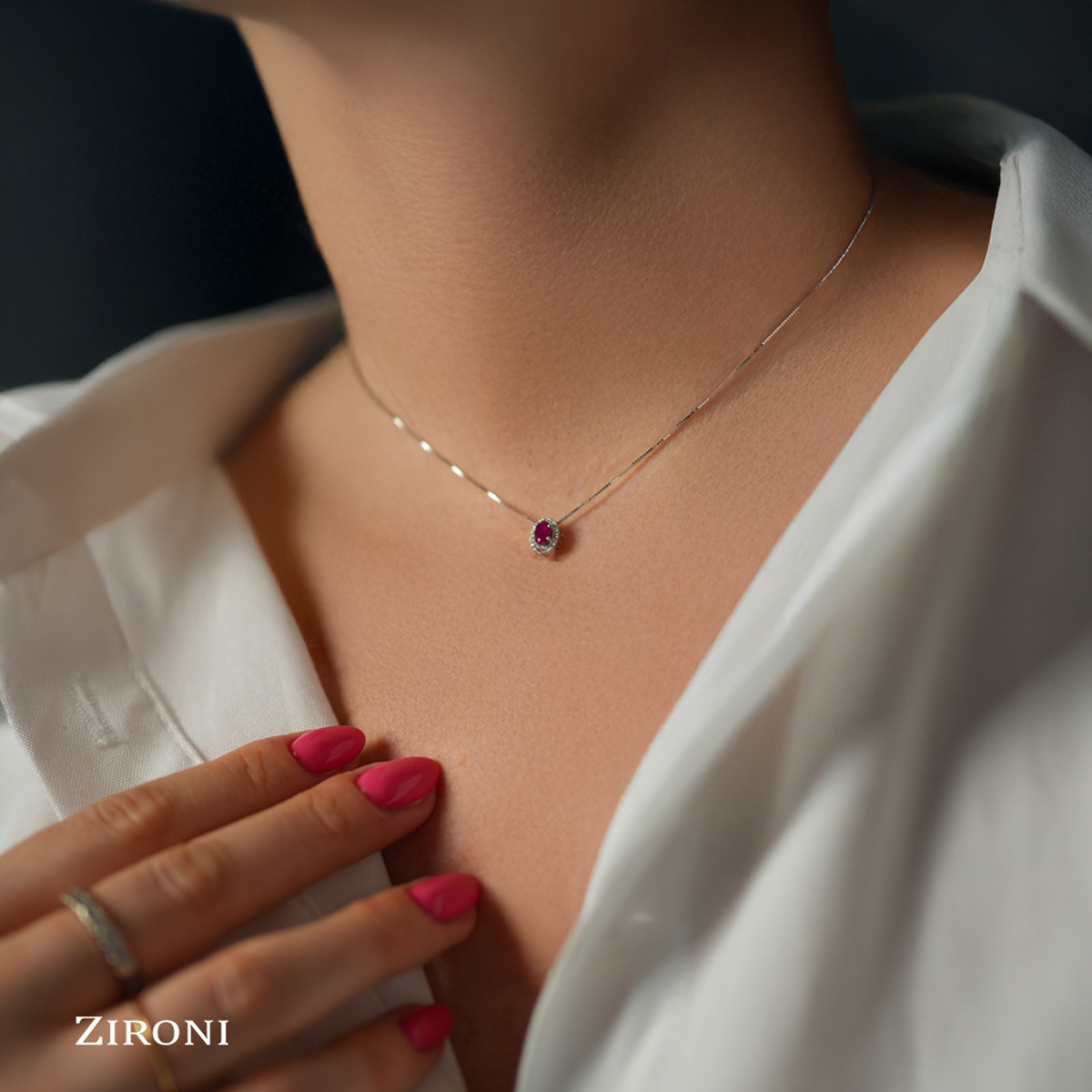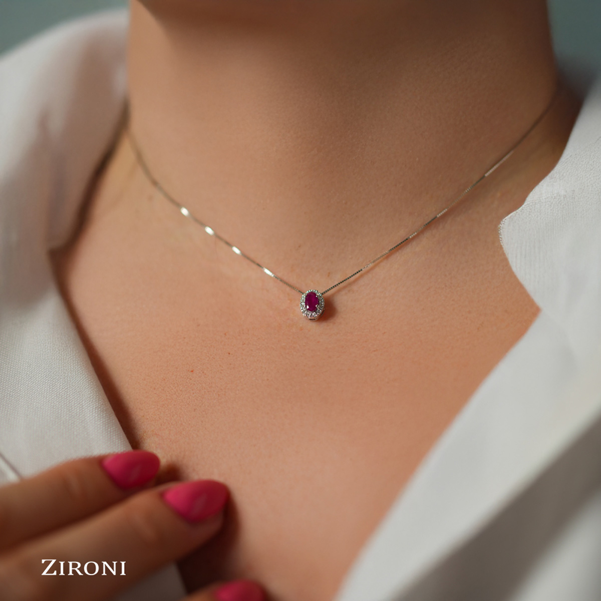 Girocollo in oro bianco 18K con rubino taglio ovale (0,32 ct) e contorno di diamanti taglio brillante (0,09 ct - G/H - SI)