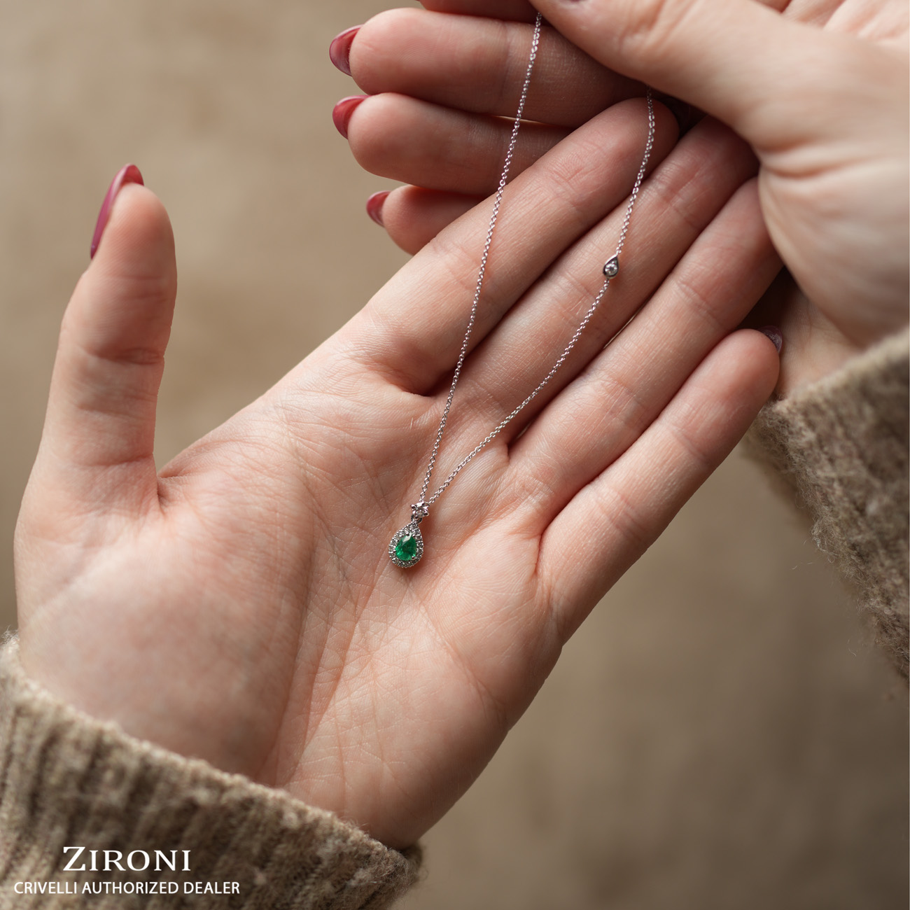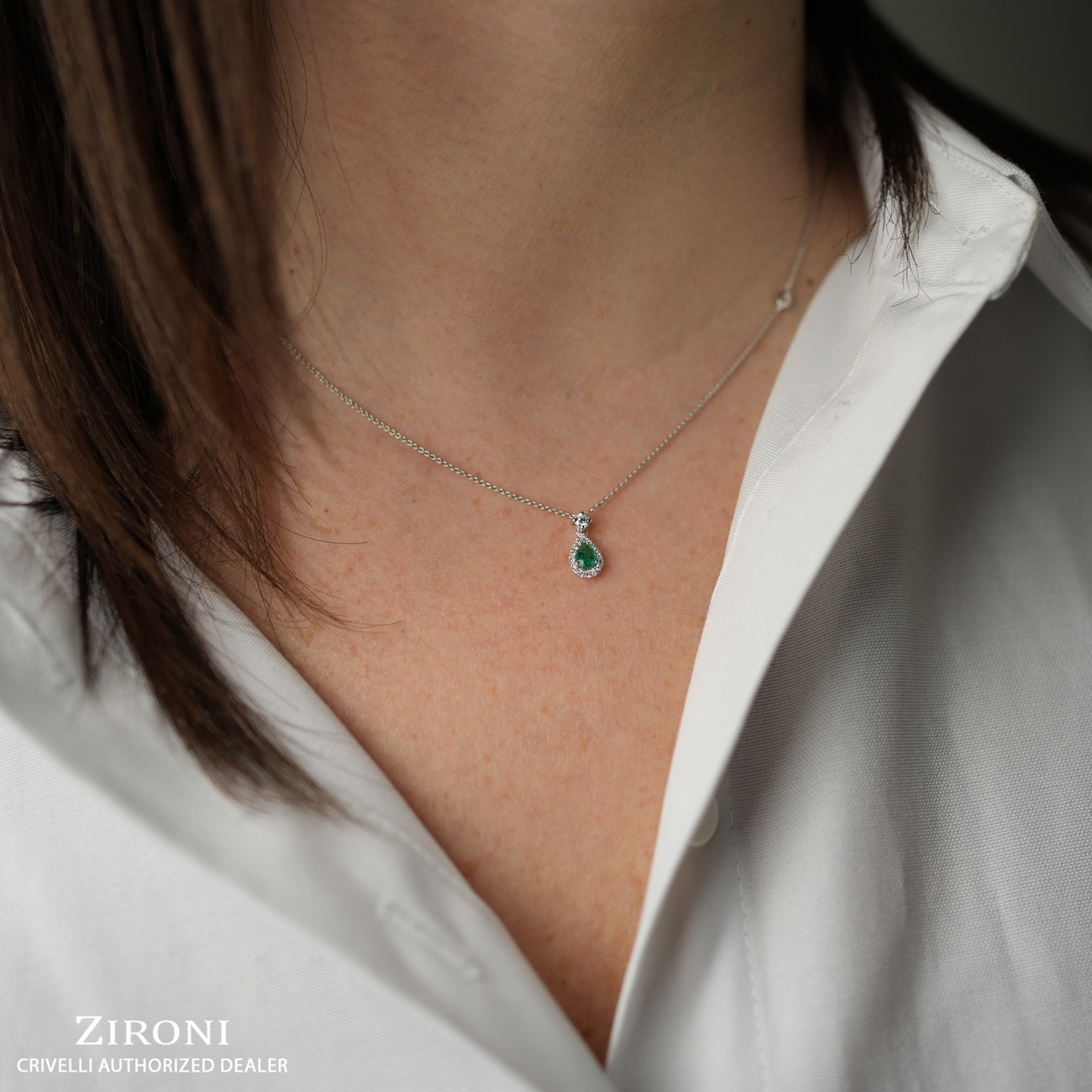 Girocollo in oro bianco con smeraldo (ct 0.26) taglio goccia e contorno di diamanti (ct 0.17) taglio brillante