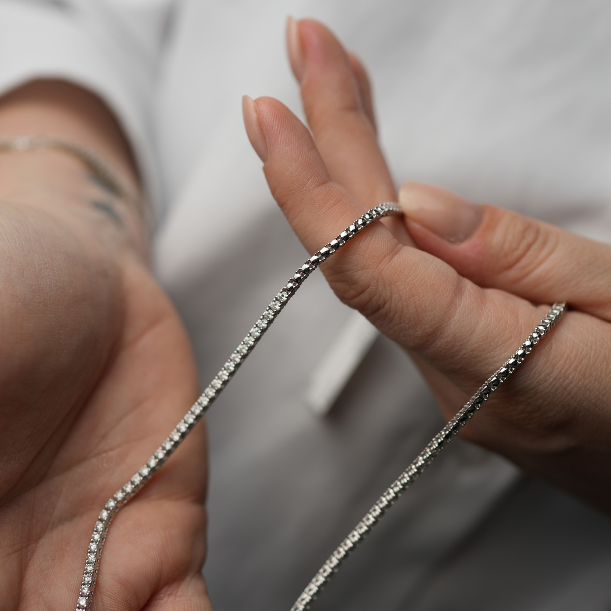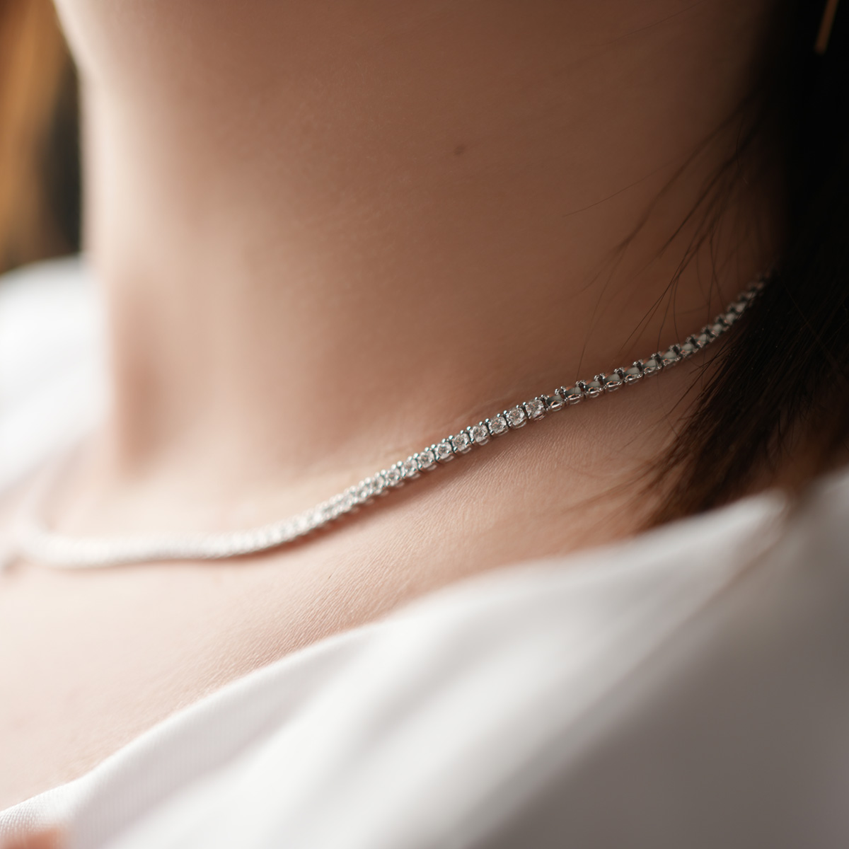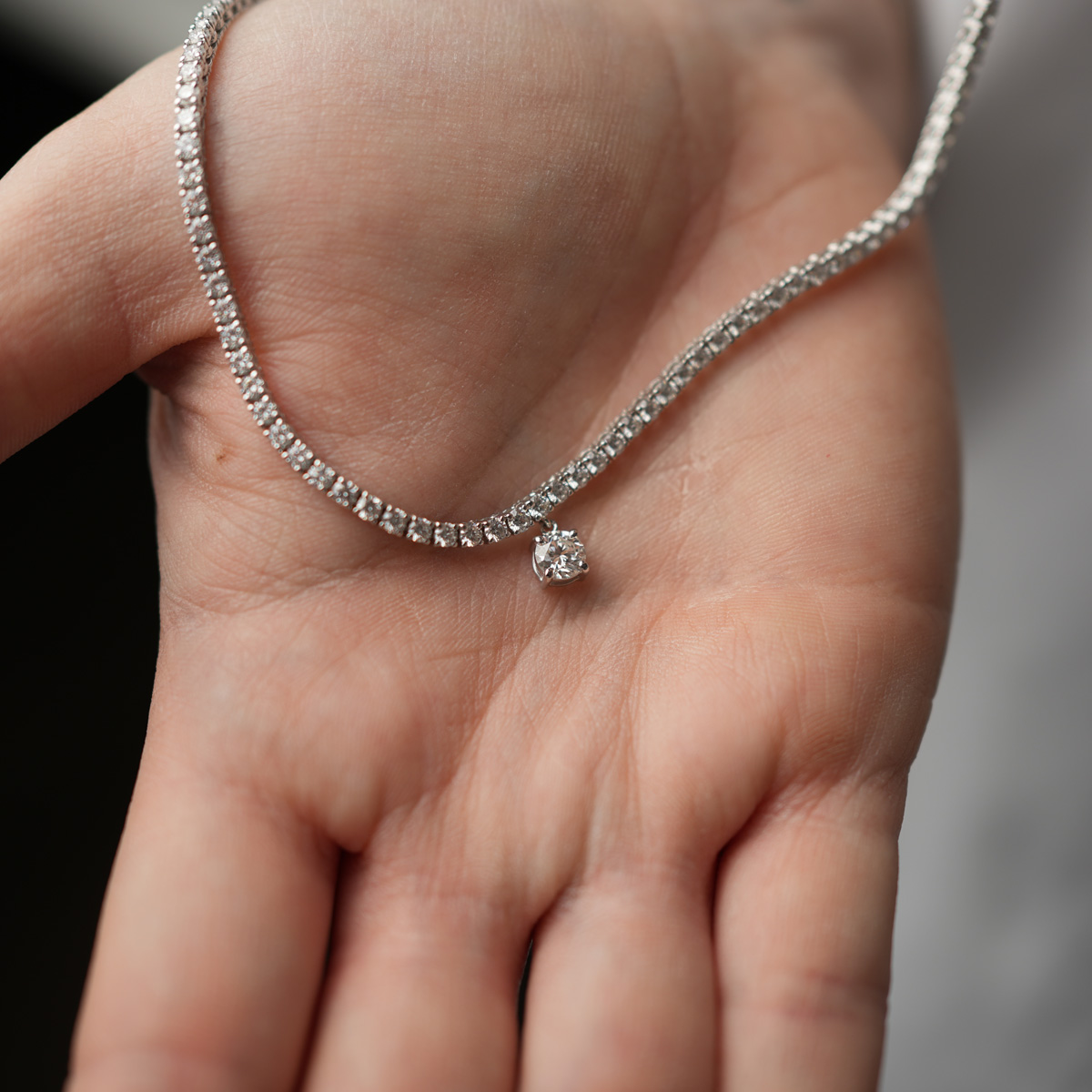 Girocollo tennis in oro bianco 18K incassato per metà, con 1 diamante pendente e 87 diamanti taglio brillante (ct 3,80 - F - SI) - 42 cm