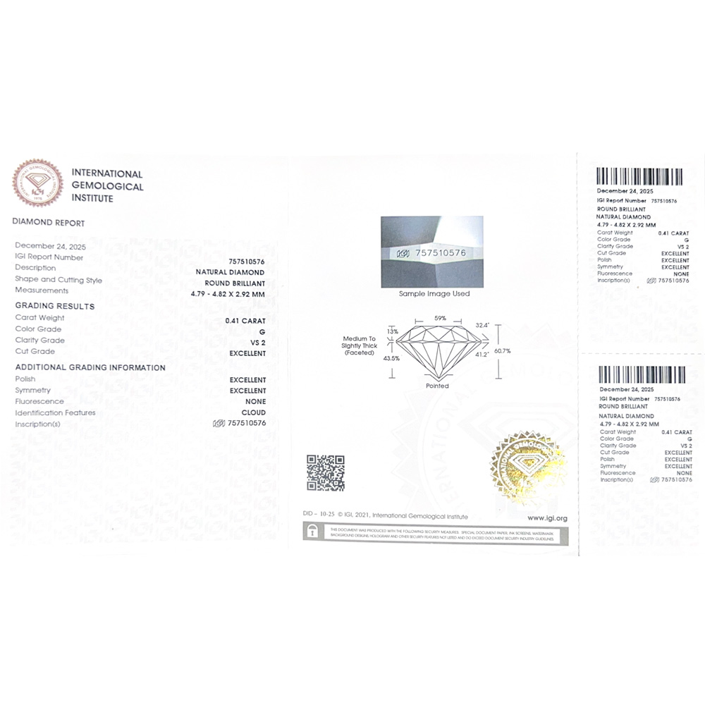 Il diamante più grande da 0,41 ct è dotato di certificato internazionale IGI.