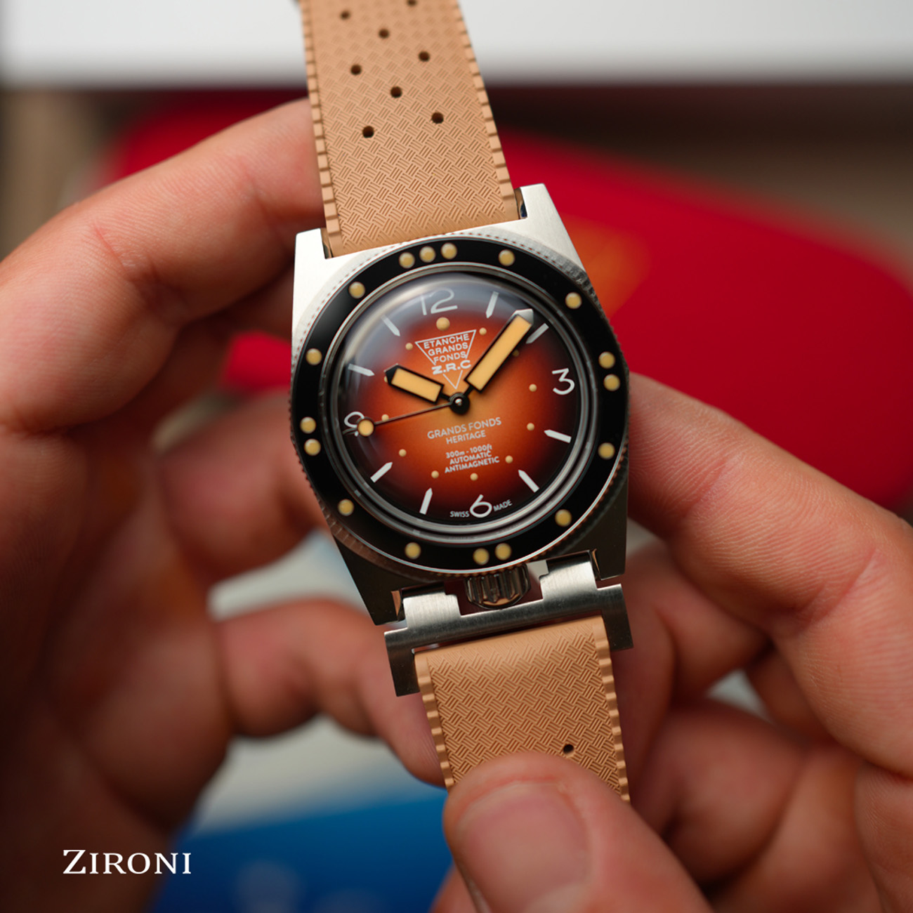 Questa nuova versione della gamma HERITAGE dei Grands Fonds® 1964 presenta un quadrante tropicalizzato che offre un look vintage ricco di fascino.