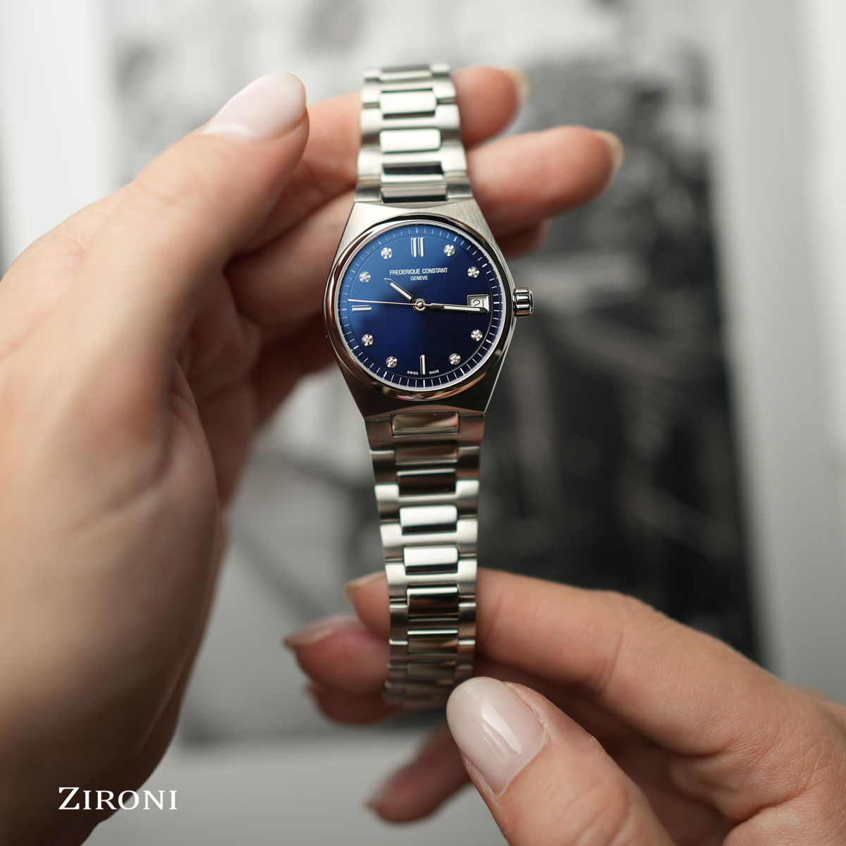 La collezione Highlife di Frederique Constant è decisamente incentrata sul momento presente. Incarna lo spirito del suo tempo, abbraccia le tendenze attuali e rimane chic e impertinente allo stesso tempo. I modelli Highlife Ladies al quarzo indicano ore, minuti, secondi e data a ore tre. Dotati del caratteristico cinturino intercambiabile integrato della collezione, sono forniti con un cinturino in gomma aggiuntivo. Il movimento al quarzo ha un’autonomia di 5 anni.