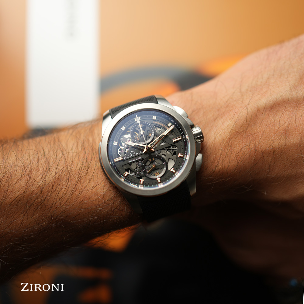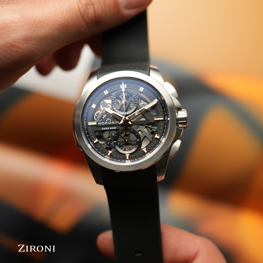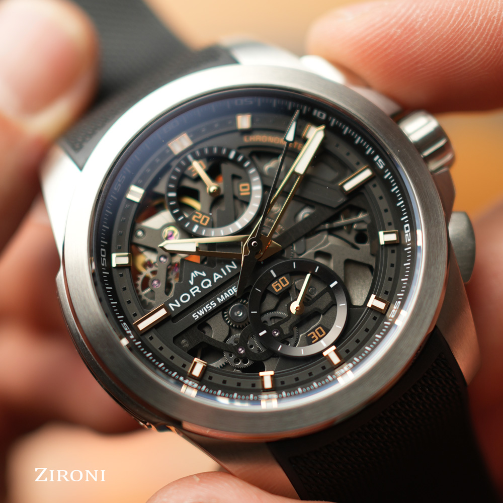 L'Independence Skeleton Chrono è alimentato dal Calibro di Manifattura NORQAIN 8K, un esclusivo movimento cronografo flyback scheletrato ad alte prestazioni ispirato alle montagne più alte del mondo. Questo modello è il primo cronografo della collezione Independence.