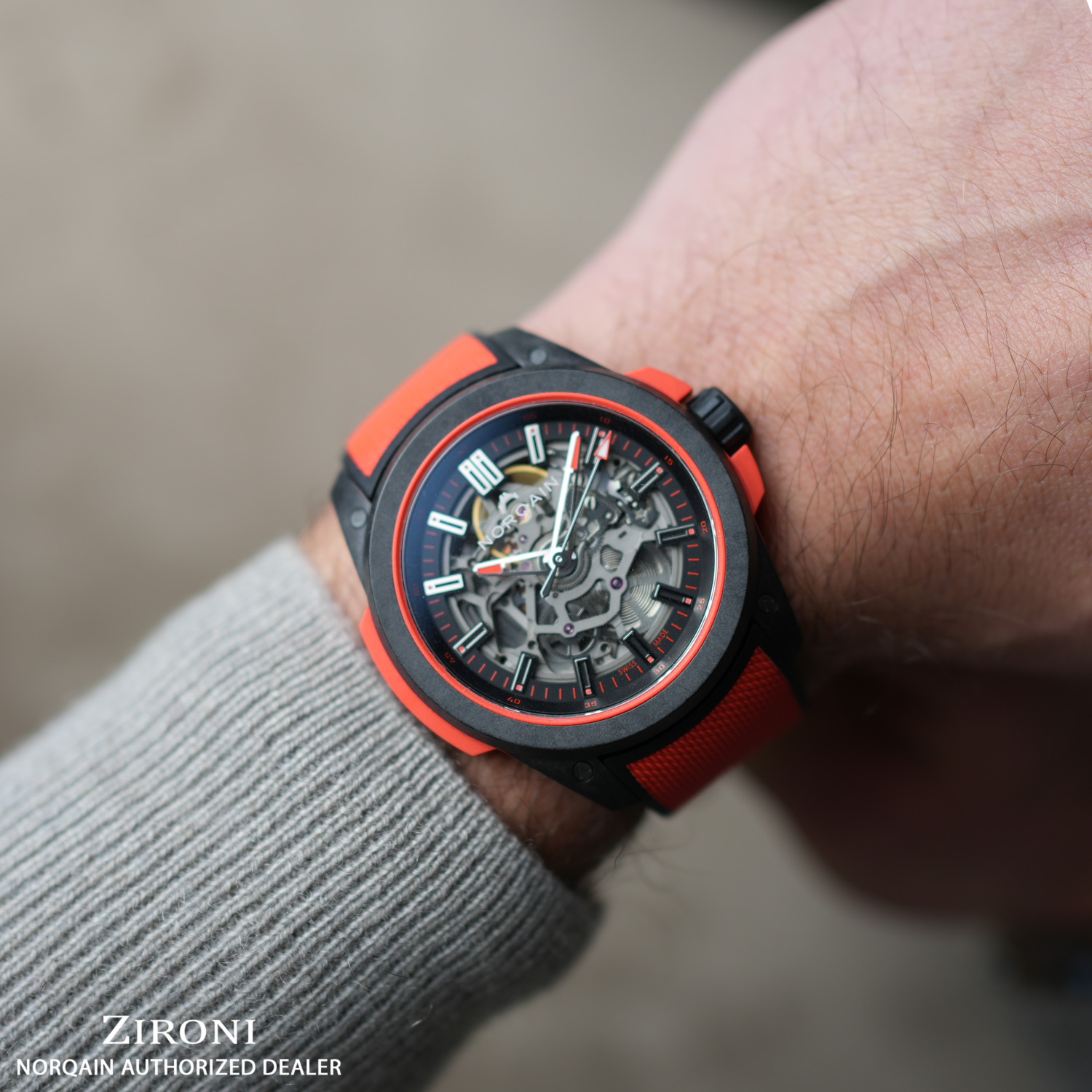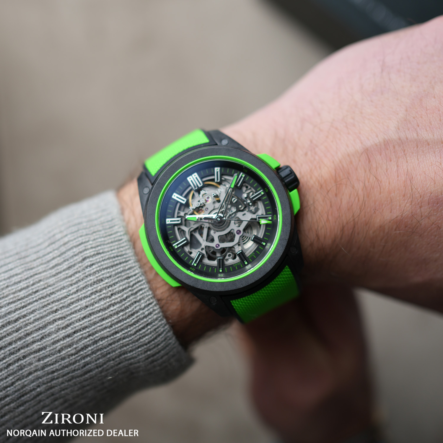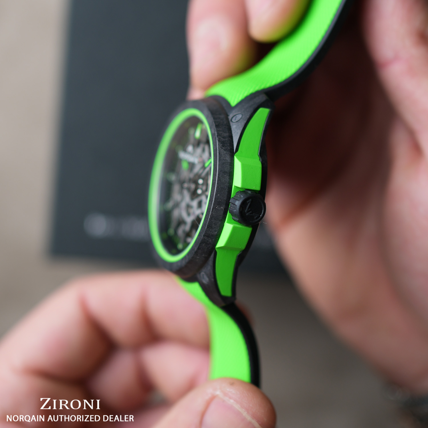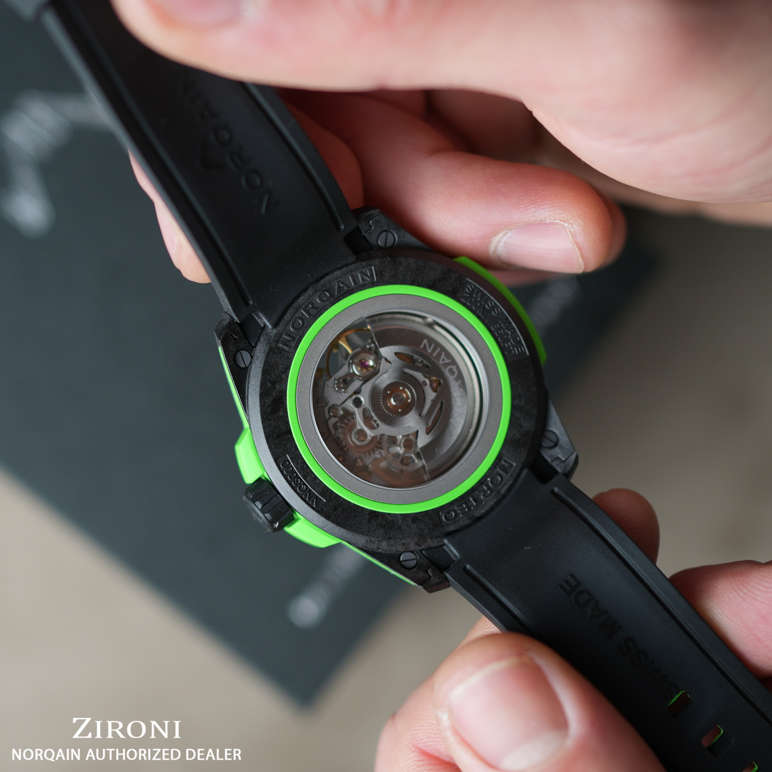 Realizzato con il nostro materiale in fibra di carbonio NORTEQ brevettato, ultra resistente e ultraleggero, il Wild ONE è l'orologio sportivo ad alte prestazioni per eccellenza. Sei volte più leggero dell'acciaio e 3,5 volte più leggero del titanio, questo Wild ONE è stato progettato in collaborazione con Jean-Claude Biver, il team NORQAIN e i migliori fornitori svizzeri