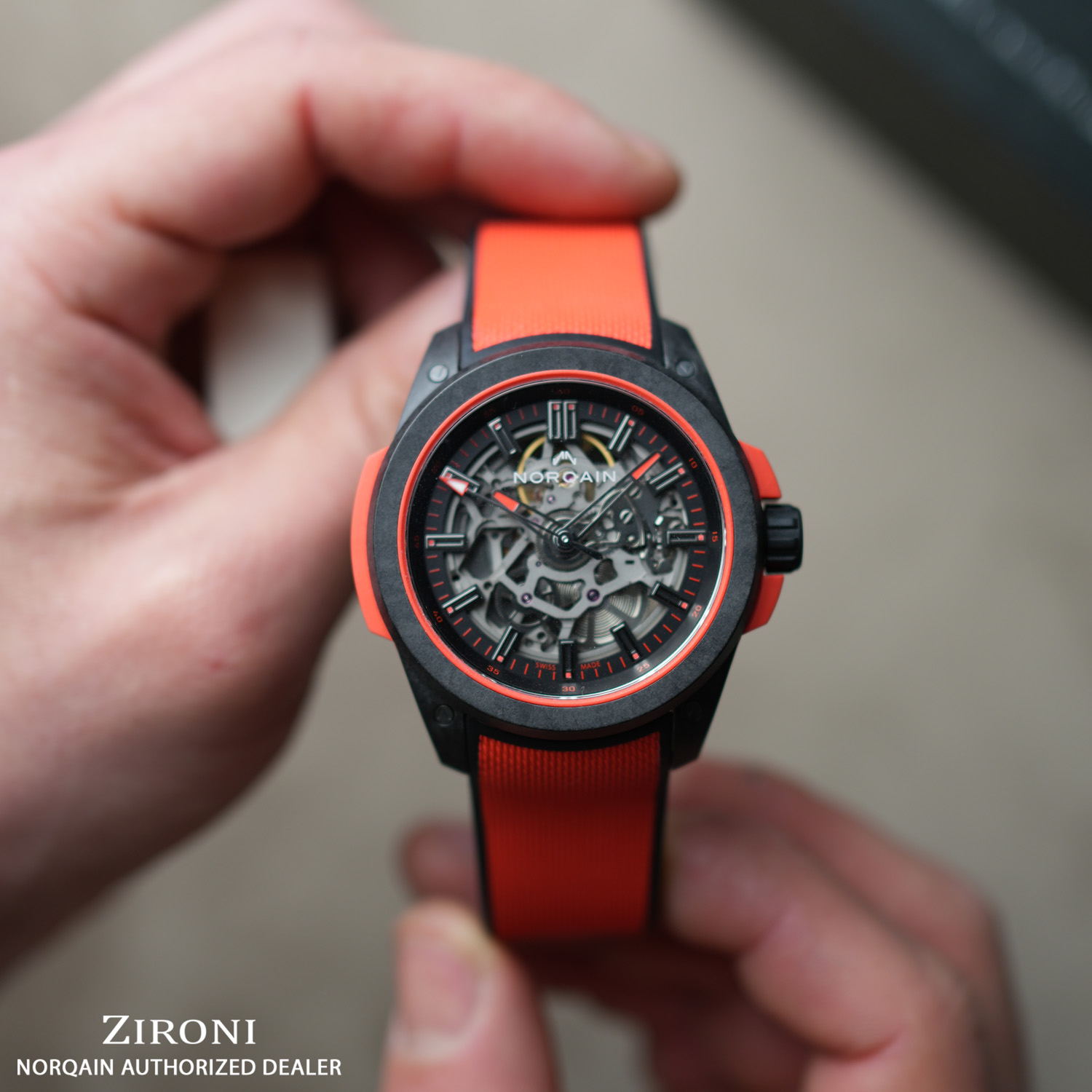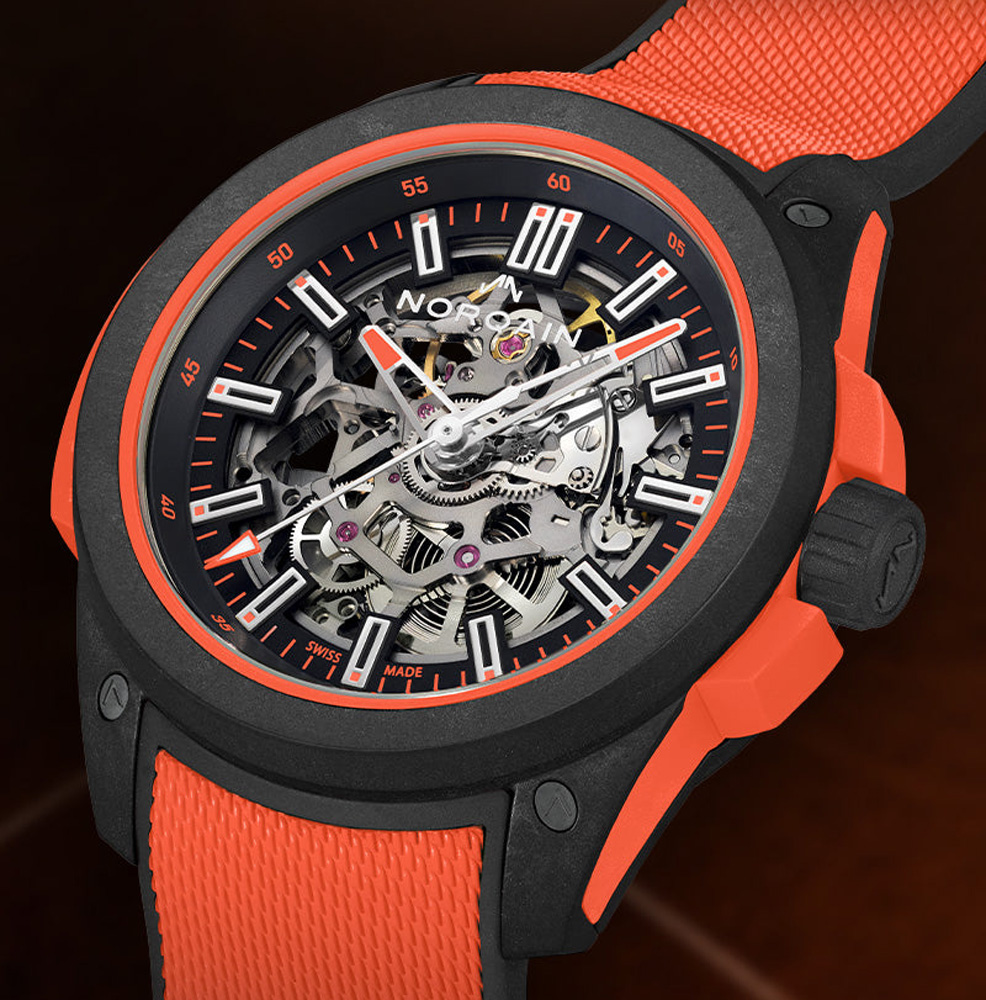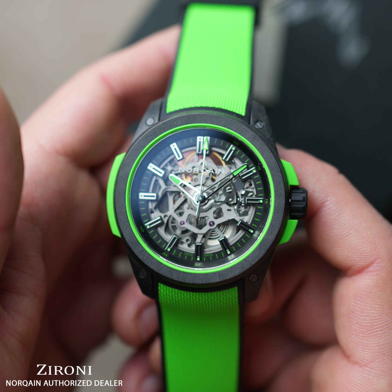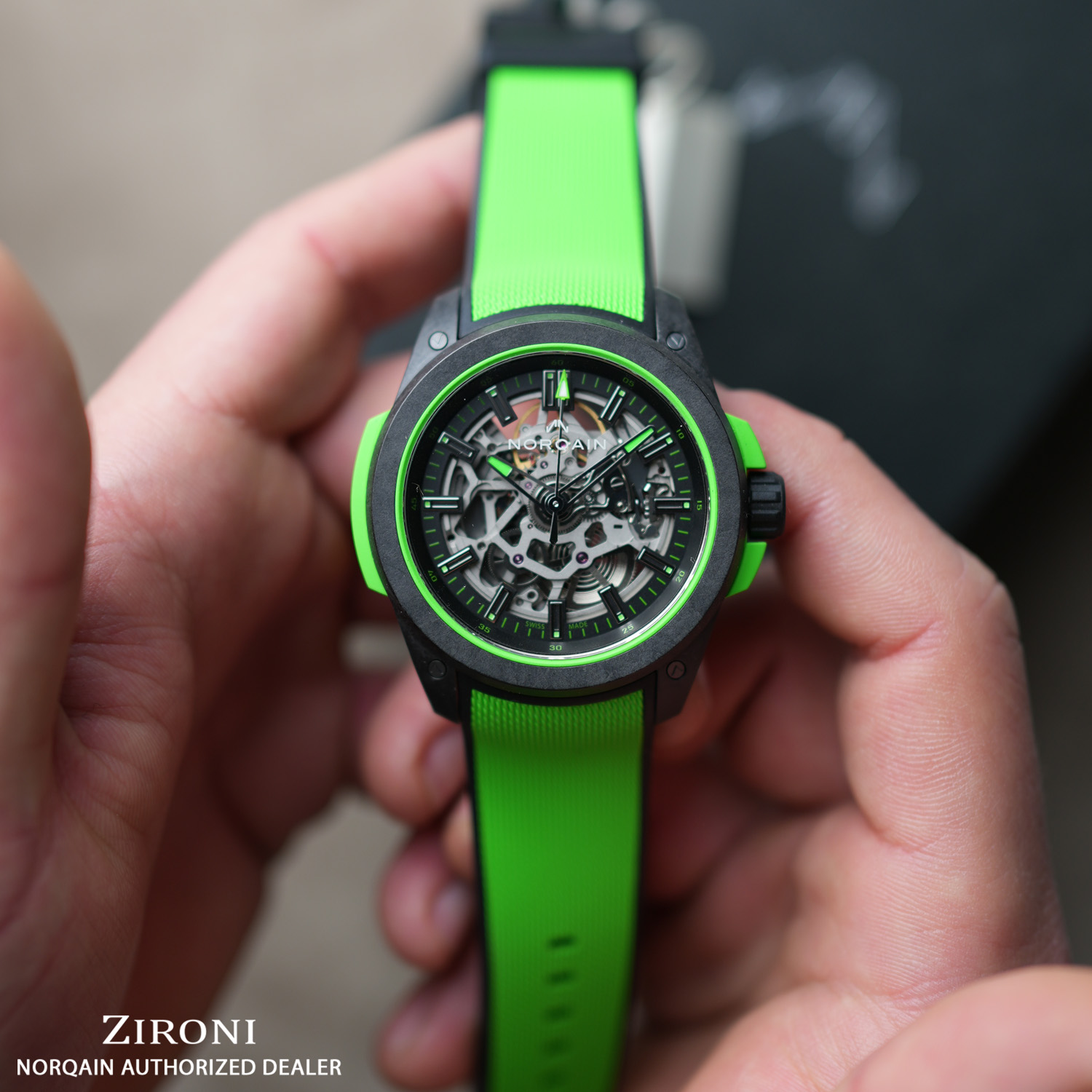 Realizzato con il nostro materiale in fibra di carbonio NORTEQ brevettato, ultra resistente e ultraleggero, il Wild ONE è l'orologio sportivo ad alte prestazioni per eccellenza. Sei volte più leggero dell'acciaio e 3,5 volte più leggero del titanio, questo Wild ONE è stato progettato in collaborazione con Jean-Claude Biver, il team NORQAIN e i migliori fornitori svizzeri