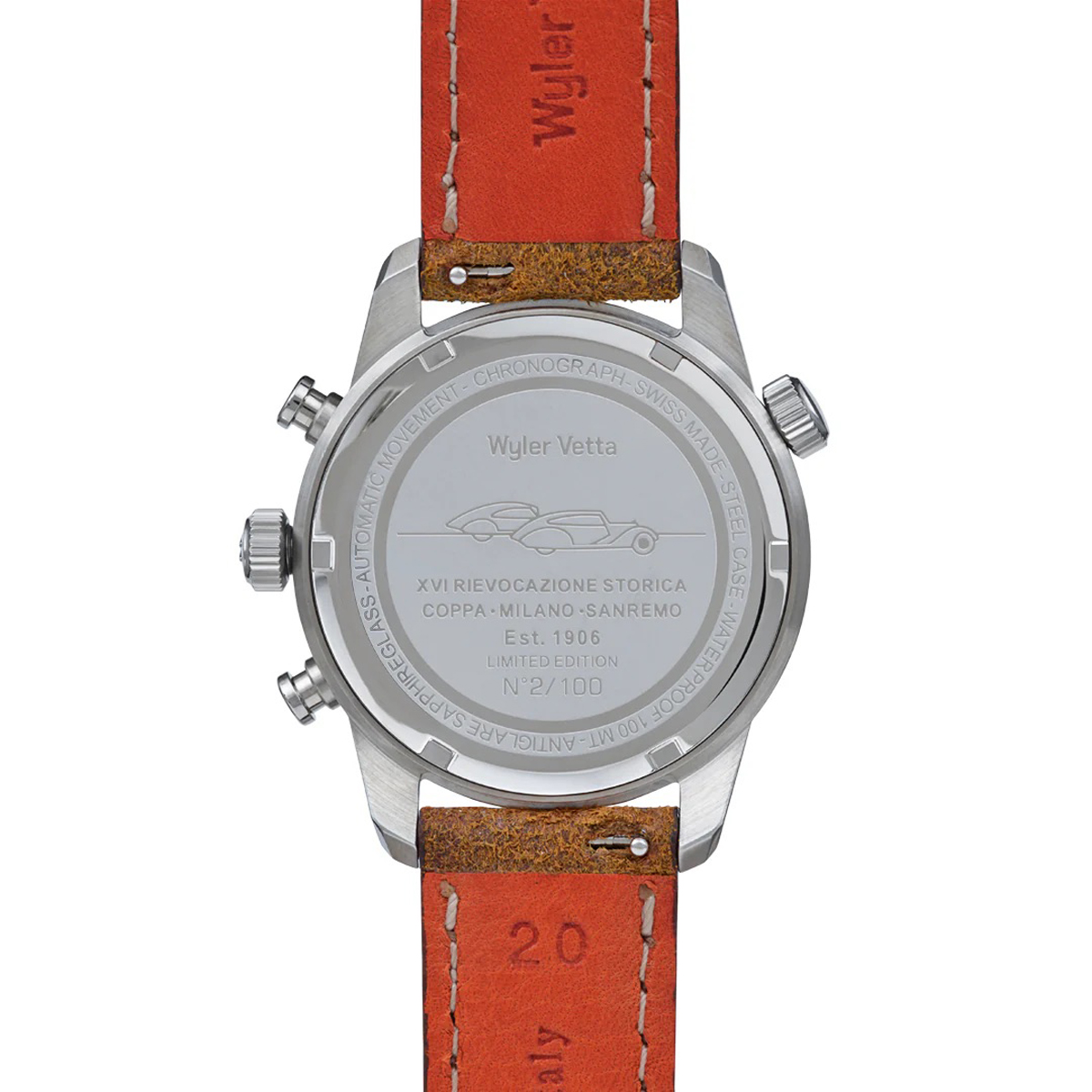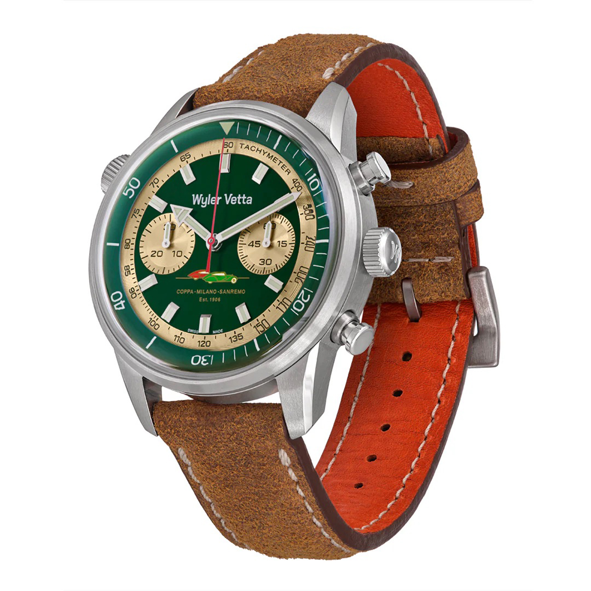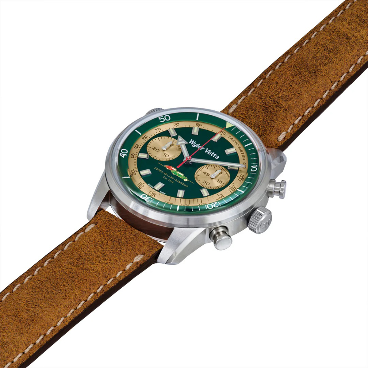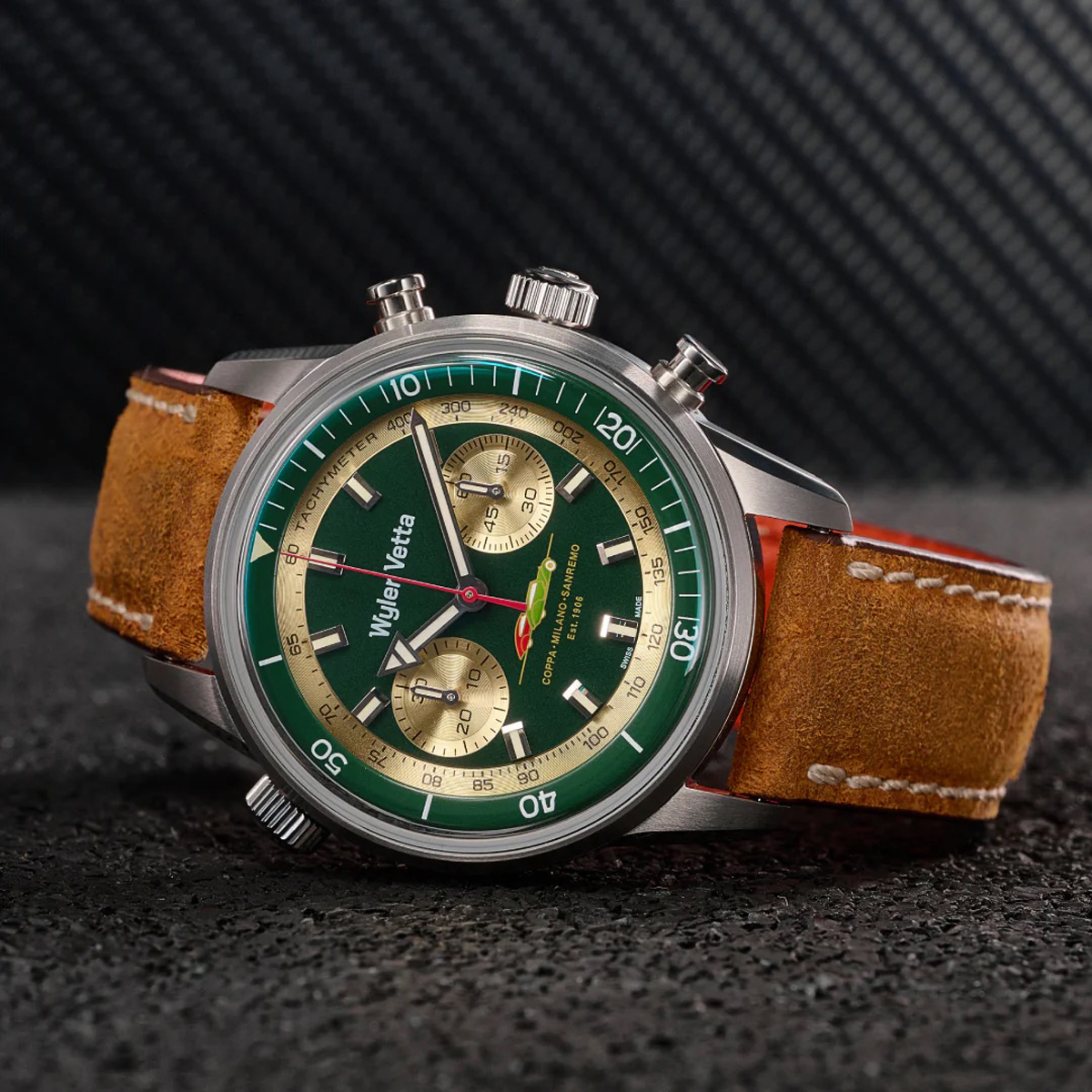 I colori del cronografo celebrativo sono il British Green e il Metallica gold, esattamente gli stessi colori che da sempre contraddistinguono il logo della manifestazione che si corre ogni anno dal 1906. Nel 2025 si rinnova per il terzo anno la partnership con la Coppa Milano-Sanremo, rievocazione della gara di automobili storiche più antica d’Italia. Sul quadrante, a ore 12 il logo Wyler Vetta, mentre a ore 6 il logo della corsa con le due classiche coupée. Il cinturino in pelle color cuoio gli attribuisce un carattere sportivo e versatile.