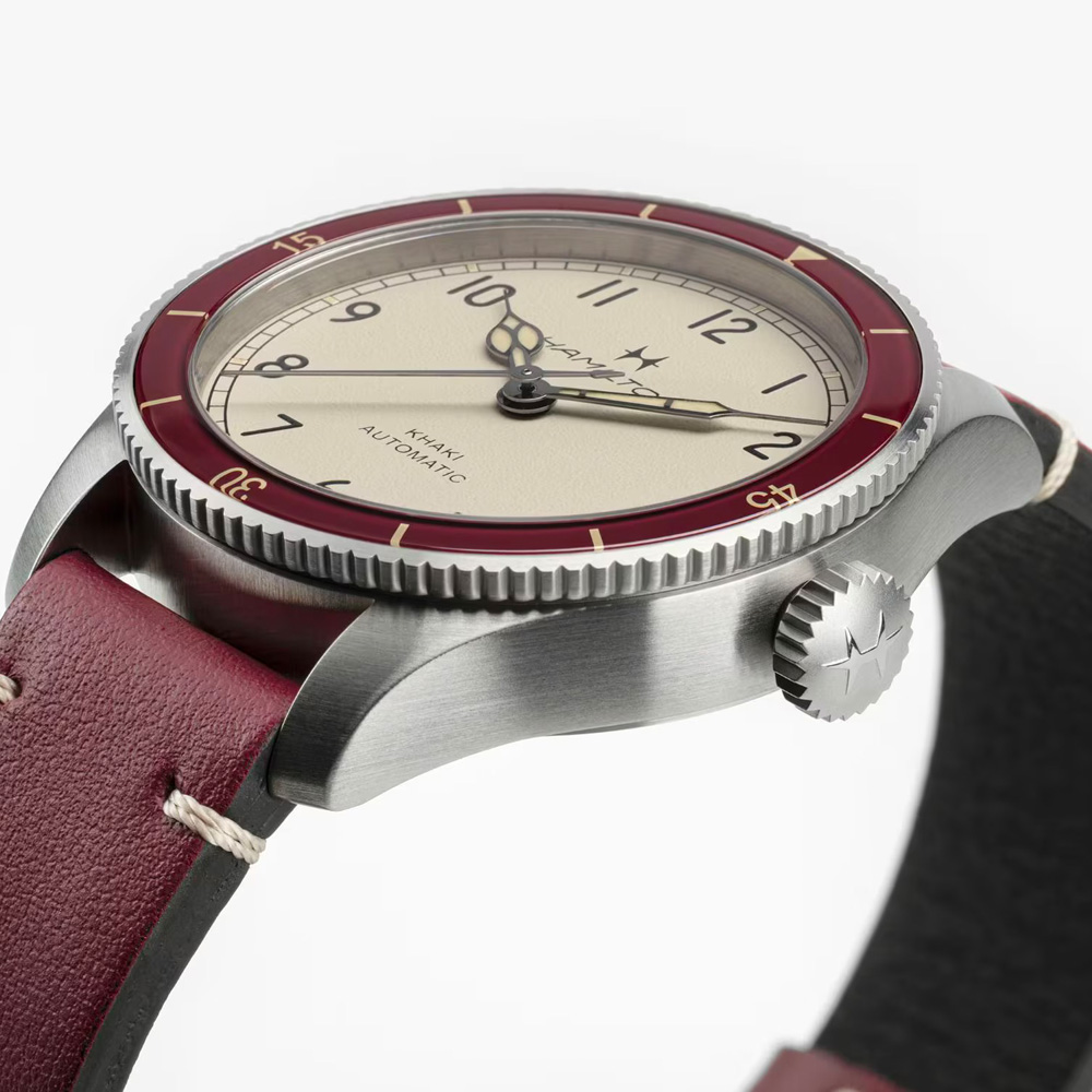 Traendo ispirazione dal Model 23, avanguardistico orologio da tasca usato dai soldati statunitensi durante la Seconda Guerra Mondiale, il design caratteristico del Khaki Aviation Pilot Pioneer è un tributo al legame di Hamilton con l’aviazione e alla sua tradizione militare. Con numeri ultra leggibili, lancette a cattedrale e una minuteria a binario esterna, questo orologio automatico da pilota da 38mm presenta un carattere sportivo ma raffinato allo stesso tempo.