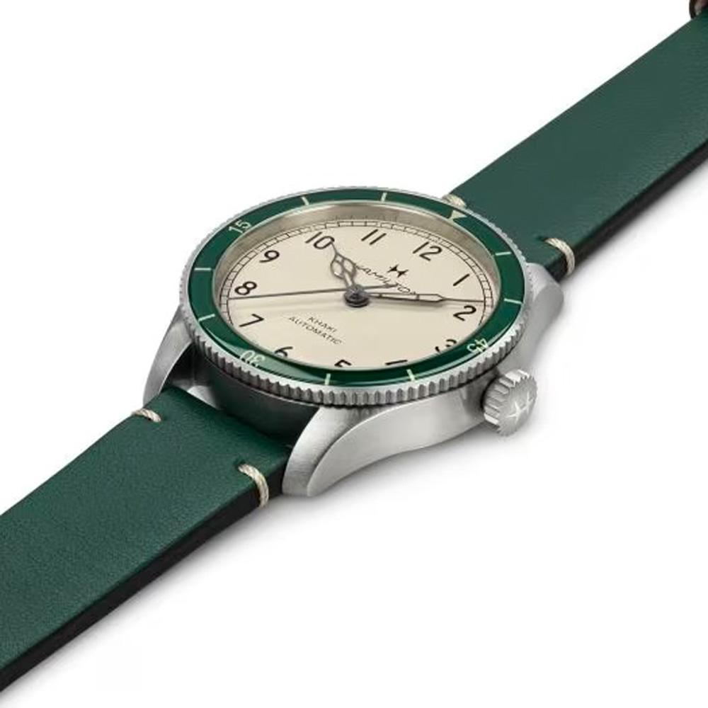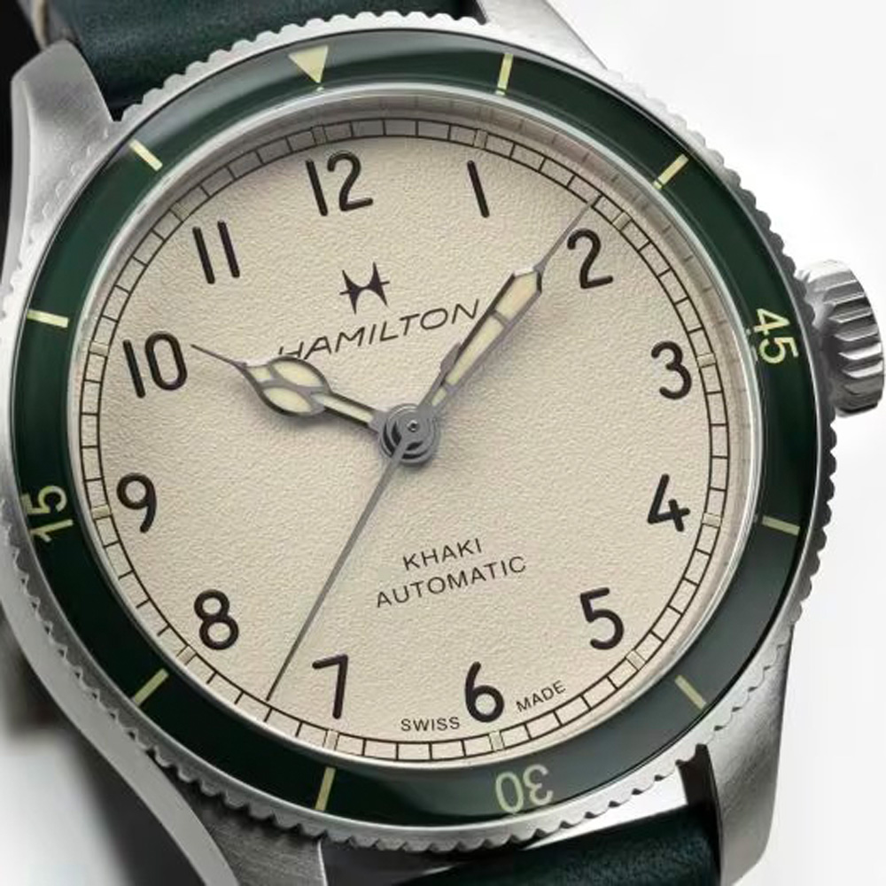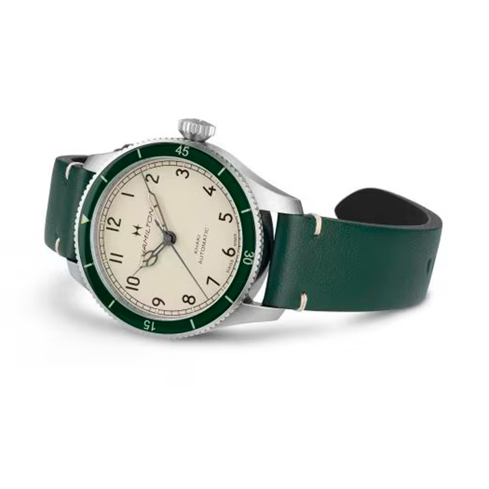 Traendo ispirazione dal Model 23, avanguardistico orologio da tasca usato dai soldati statunitensi durante la Seconda Guerra Mondiale, il design caratteristico del Khaki Aviation Pilot Pioneer è un tributo al legame di Hamilton con l’aviazione e alla sua tradizione militare. Con numeri ultra leggibili, lancette a cattedrale e una minuteria a binario esterna, questo orologio automatico da pilota da 38mm presenta un carattere sportivo ma raffinato allo stesso tempo.