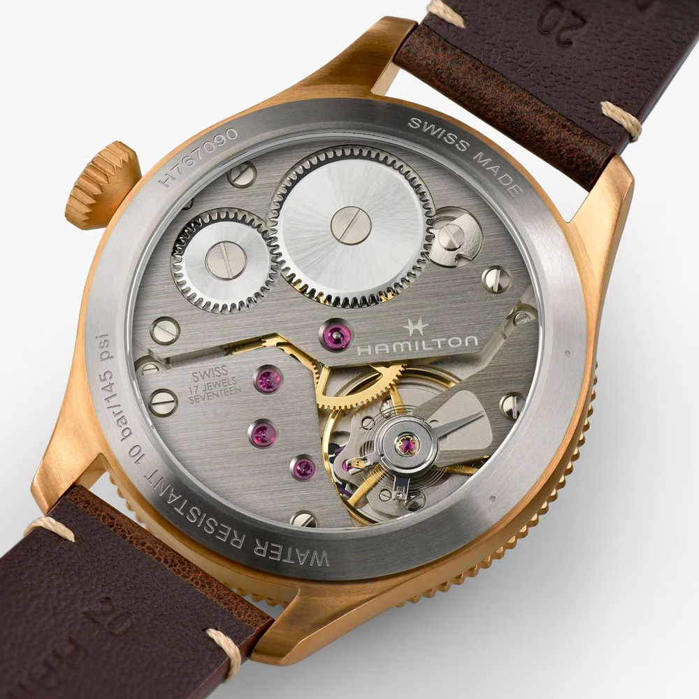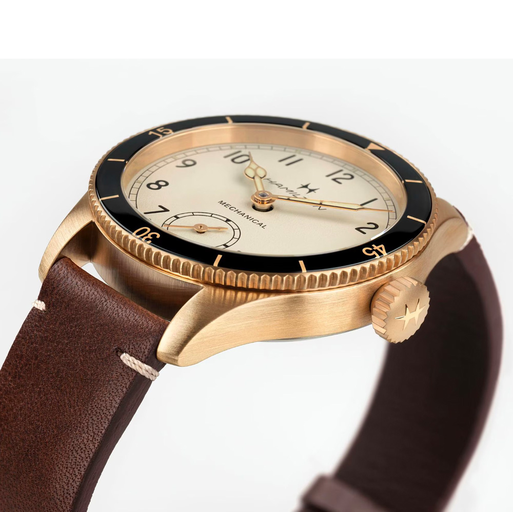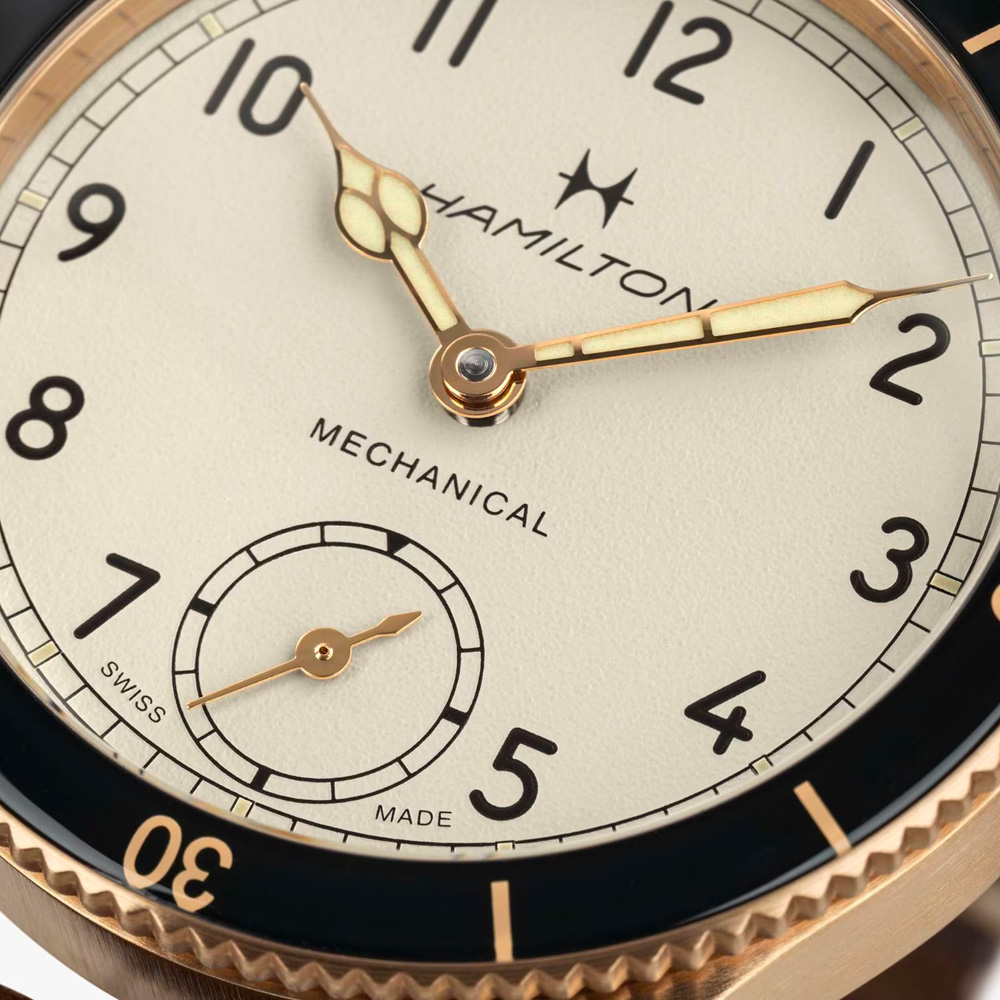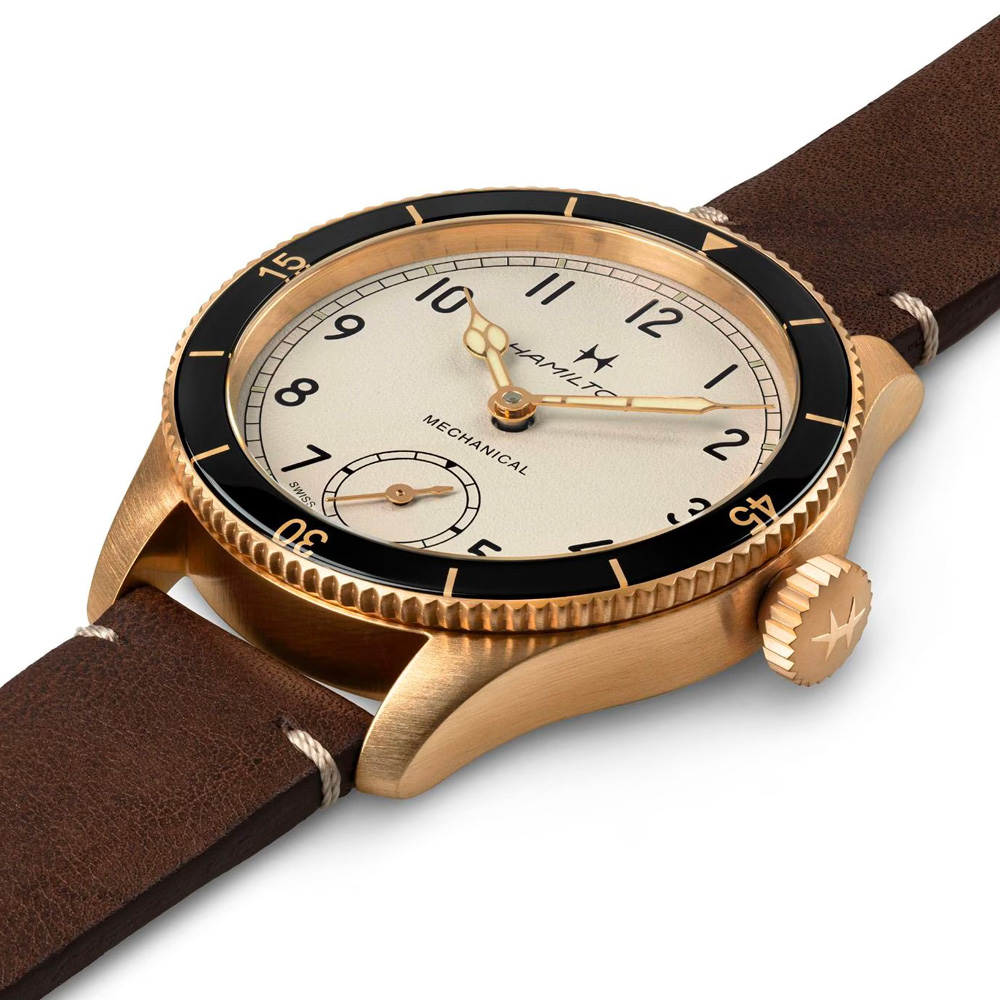 Traendo ispirazione dal Model 23, avanguardistico orologio da tasca usato dai soldati statunitensi durante la Seconda Guerra Mondiale, il design caratteristico del Khaki Aviation Pilot Pioneer è un tributo al legame di Hamilton con l’aviazione e alla sua tradizione militare. Con numeri ultra leggibili, lancette a cattedrale e una minuteria a binario esterna, questo orologio automatico da pilota da 38mm presenta un carattere sportivo ma raffinato allo stesso tempo.