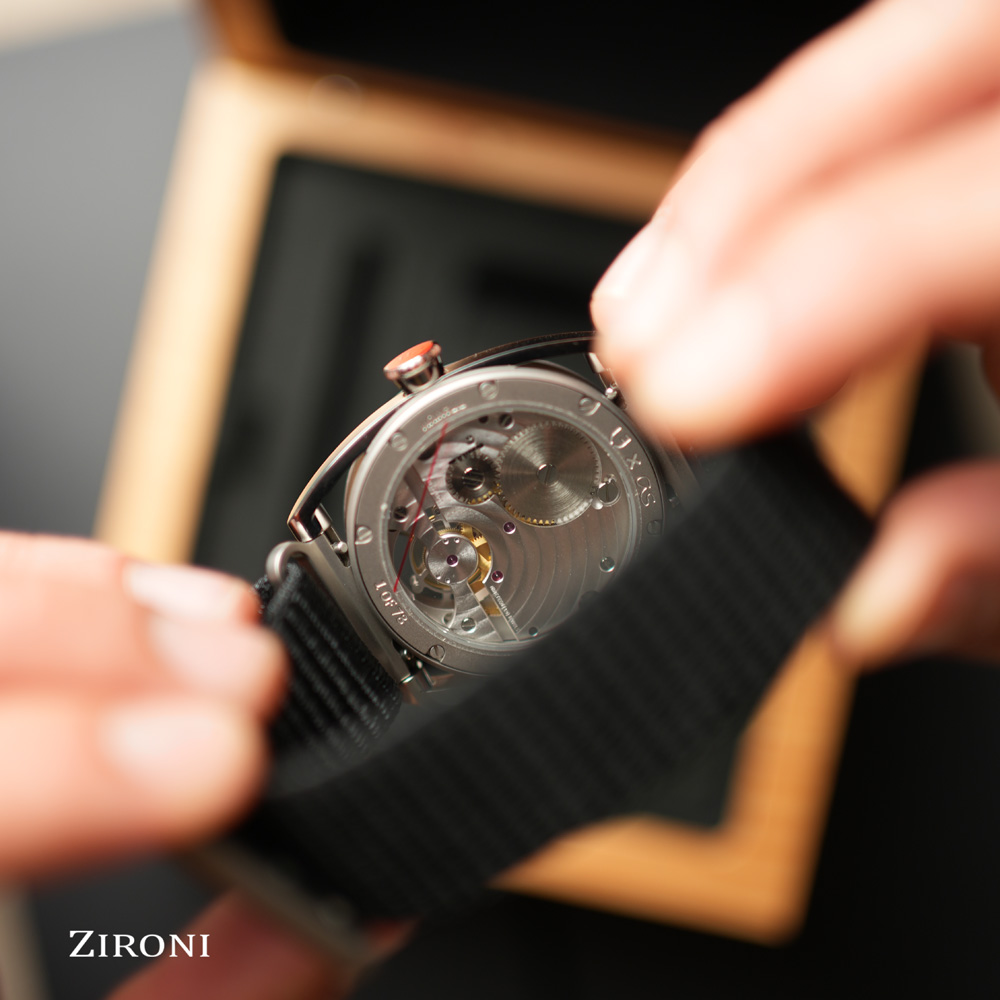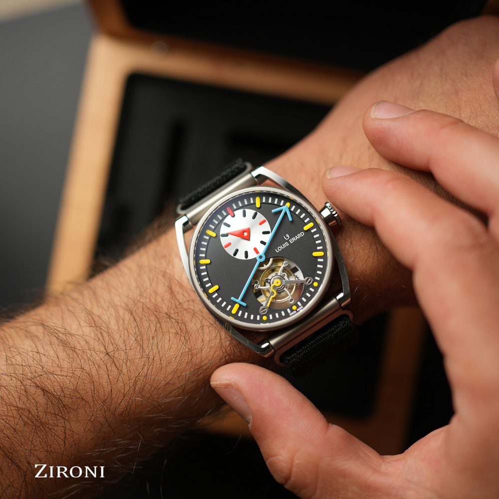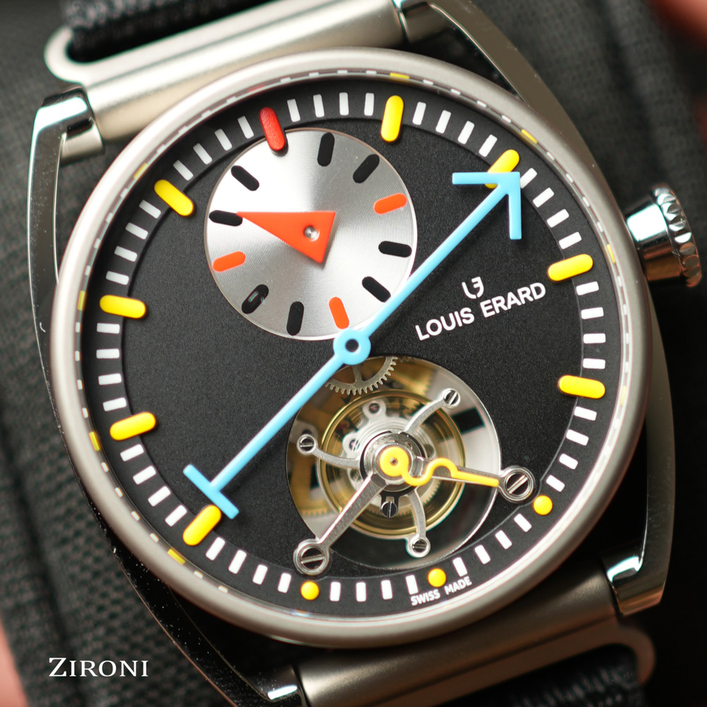 Ancora una volta, il tocco distintivo di Alain Silberstein è immediatamente visibile: una grande lancetta bianca a freccia per i minuti, un triangolo rosso per le ore e una piccola lancetta gialla a serpentina per i secondi.