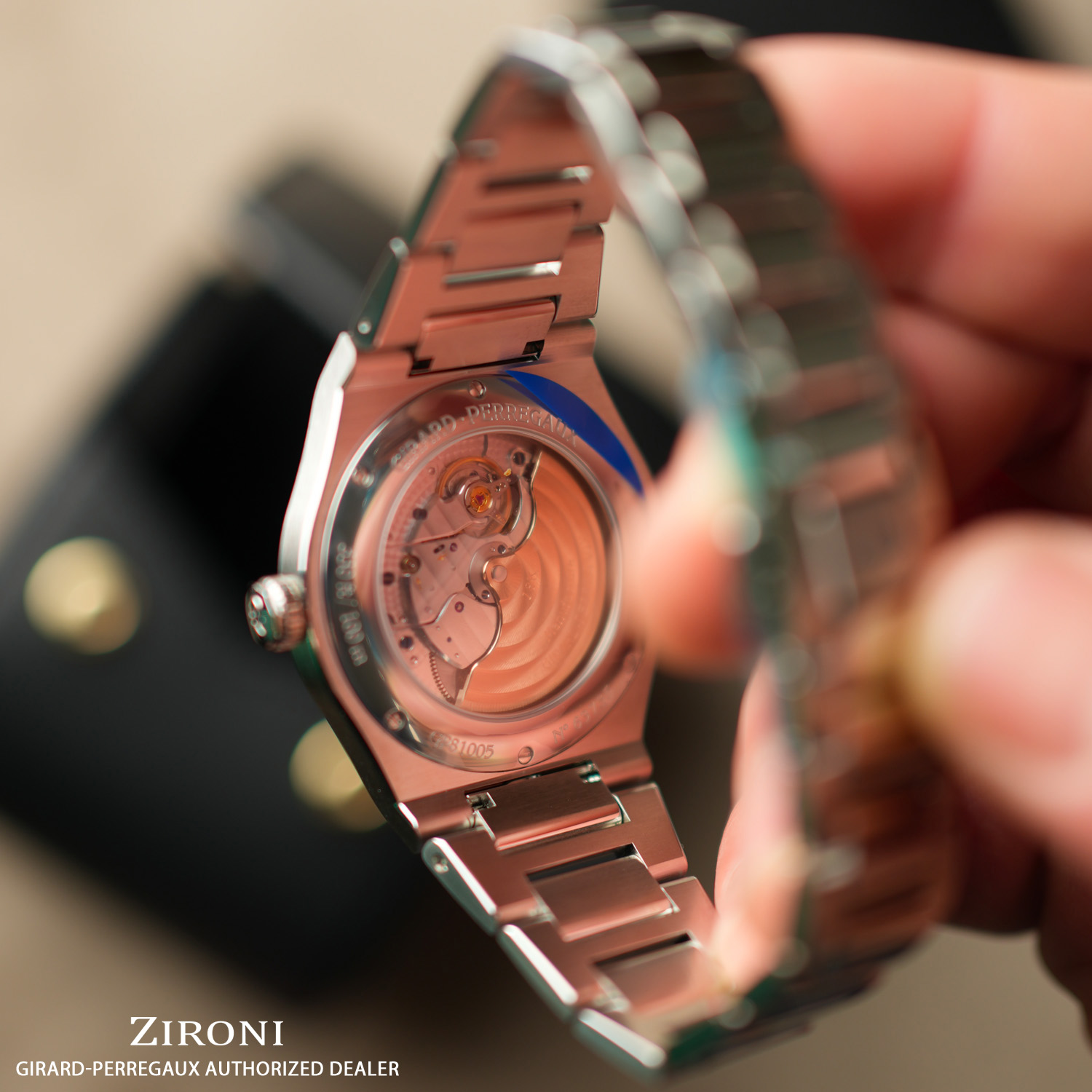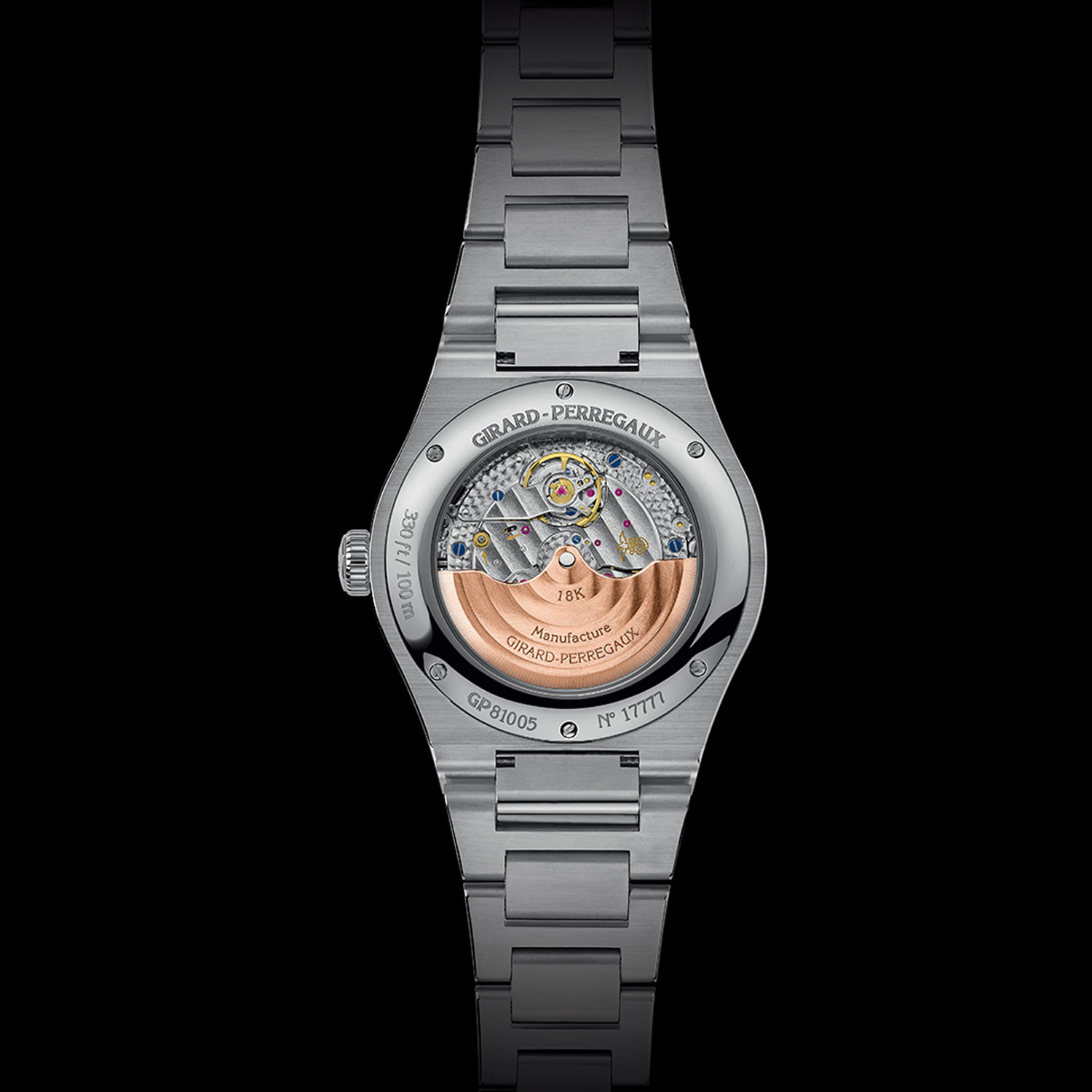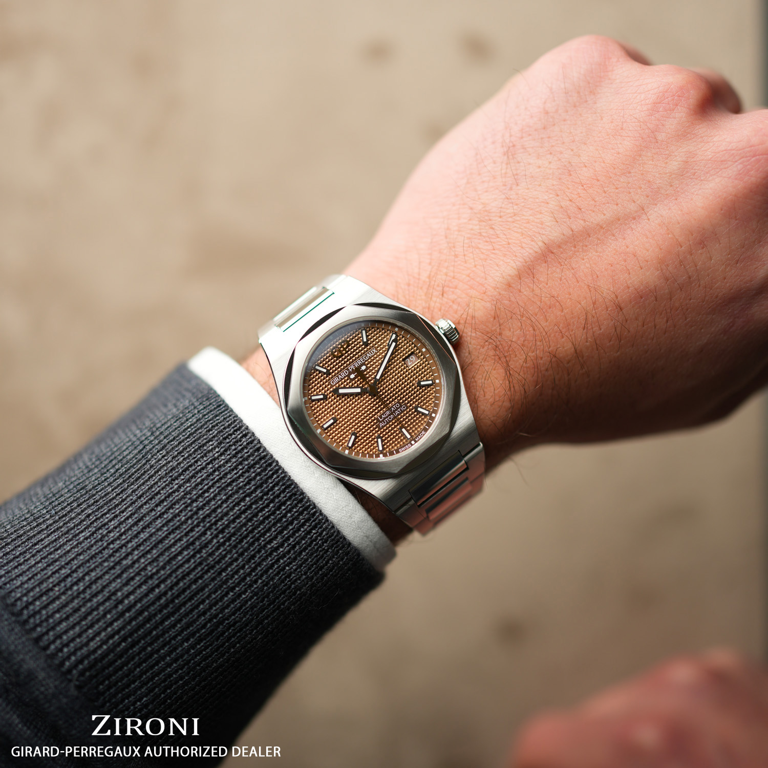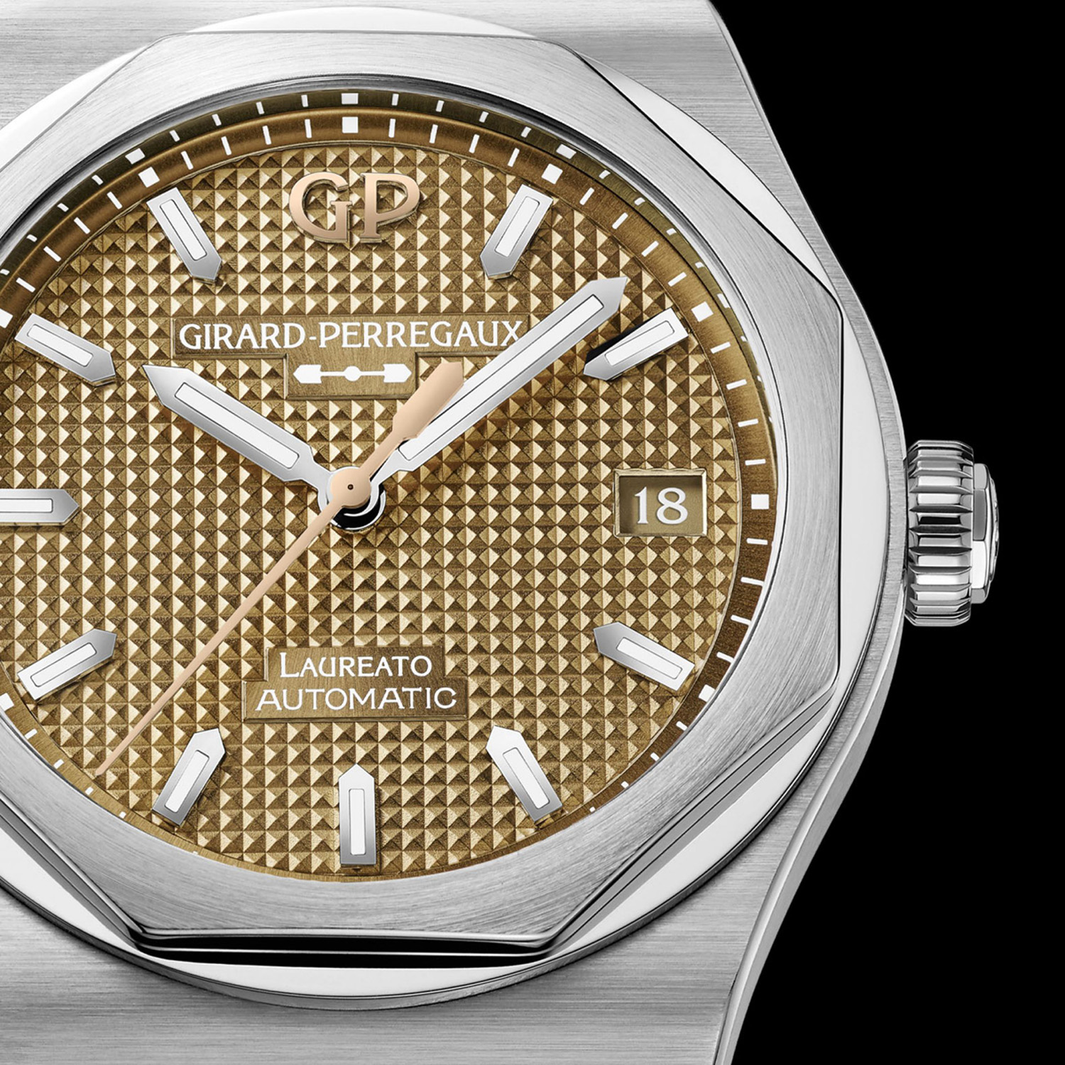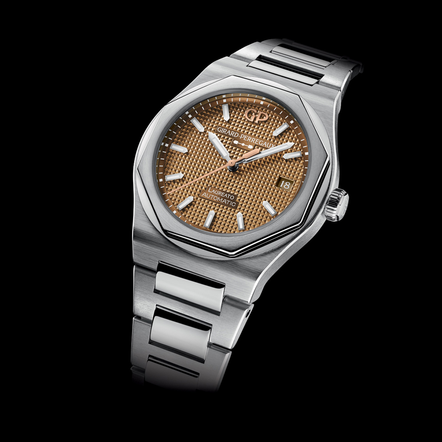 Con l'arrivo del Laureato 38 mm Copper, la Maison dimostra una volta di più la sua capacità di padroneggiare la luce. Il quadrante non è una superficie unidimensionale, ma presenta un motivo Clous de Paris. Questo motivo tradizionale è costituito da più strutture piramidali che interagiscono con la luce creando alternanze di luci e ombre. Guardando un'immagine del quadrante non si riesce a capire fino in fondo come apparirà quando polsato. Il quadrante è definito ‘copper’, rame, ma il suo carattere è molto più complesso, va dal marrone ramato all'oro rosato, passando attraverso molteplici sfumature. Il Laureato 38mm Copper, che affascina con il suo quadrante effetto metallo, è di misura media e unisex, al di là dei generi e degli stereotipi. Lancette e indici a bastone indicano ore e minuti. Questi elementi conservano il lessico del design senza tempo del Laureato, così amato dai puristi sin dalla presentazione del primo modello nel 1975.
