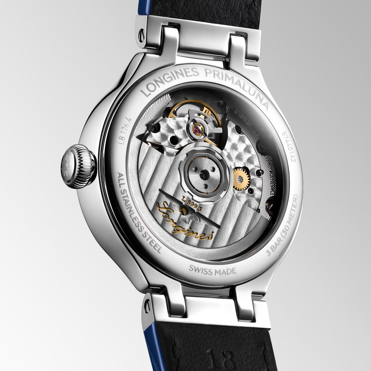 Riserva di carica Date, Movimento meccanico a carica automatica con frequenza di 25'200 alternanze orarie e riserva di carica di circa 72 ore, bilanciere-spirale in silicio monocristallino.