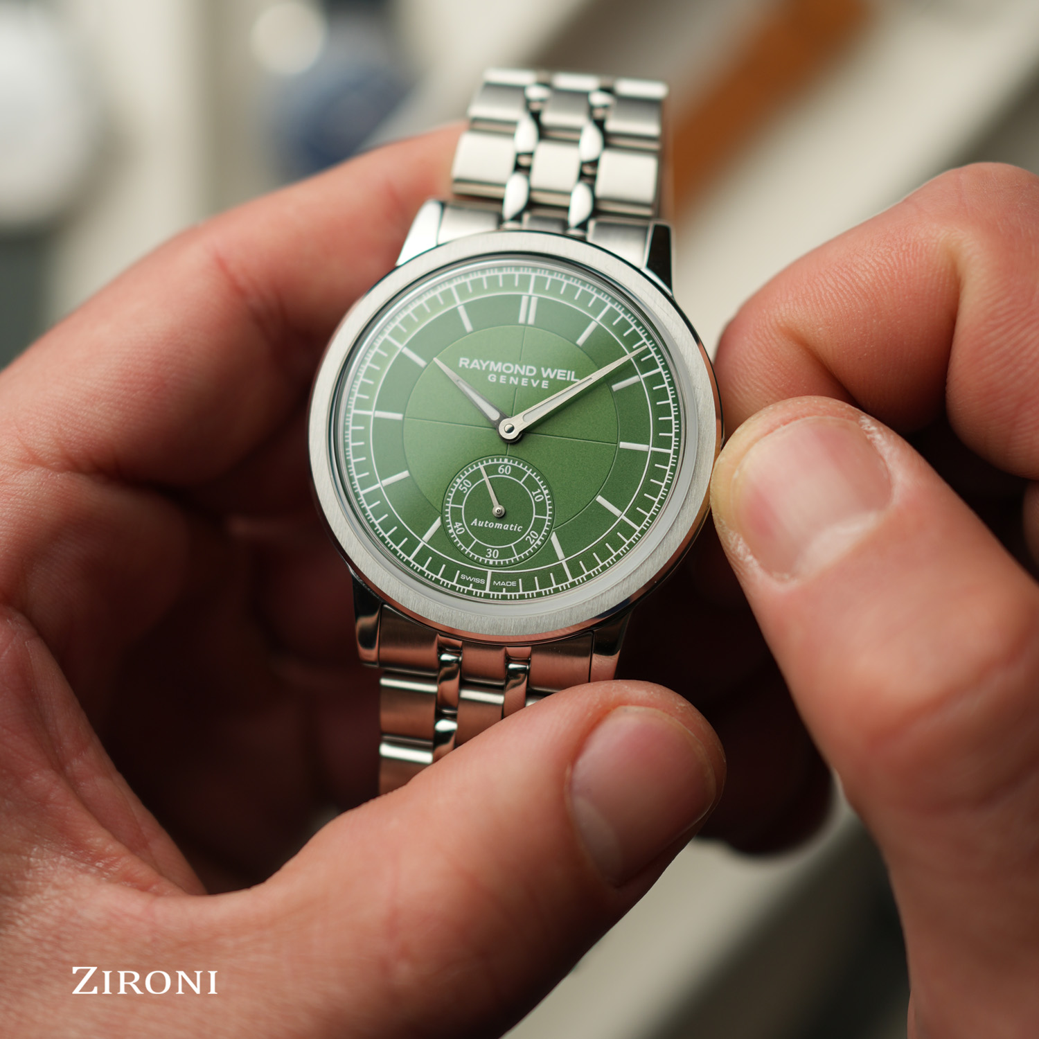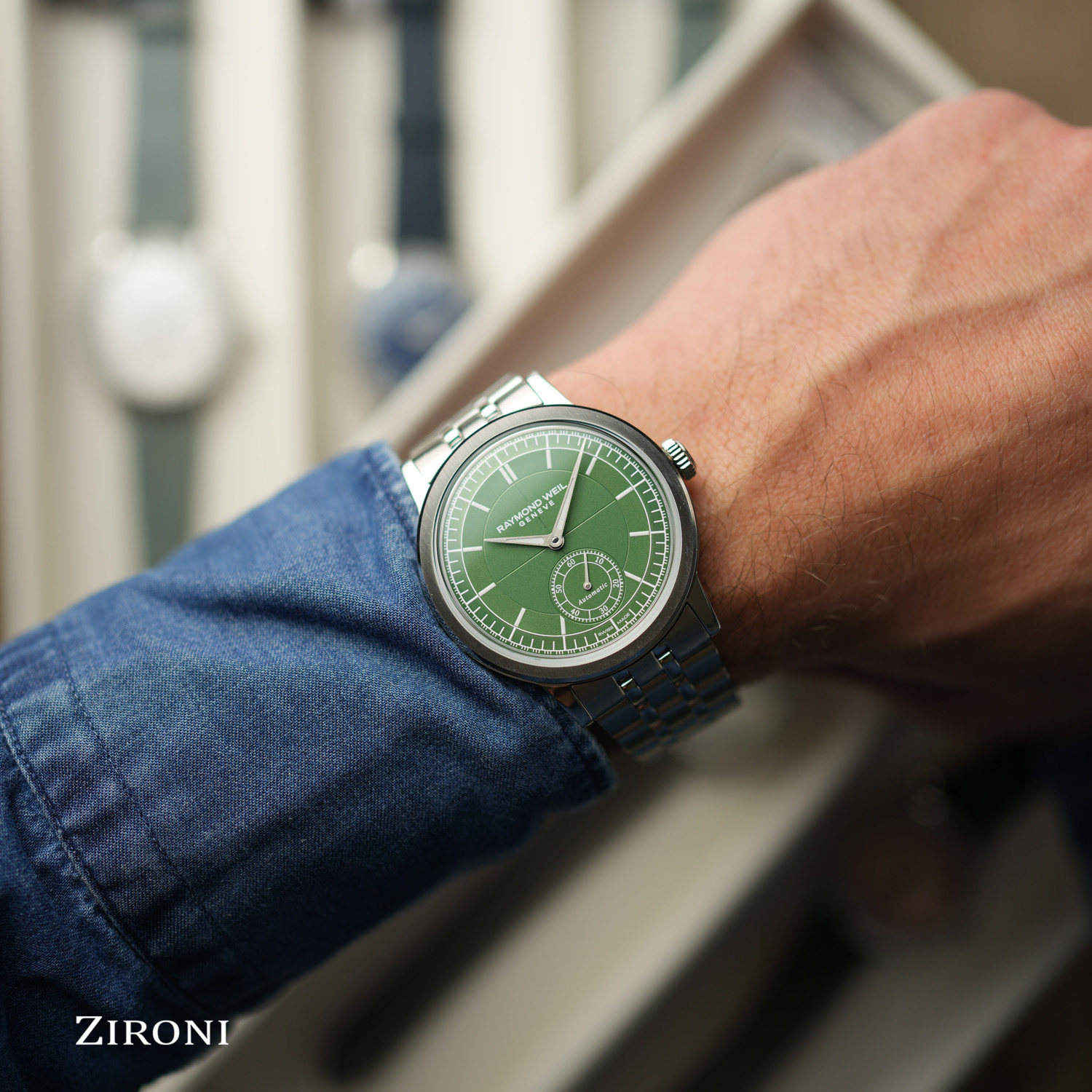 Un fondello in vetro zaffiro consente di ammirare il movimento a carica automatica al suo interno e la massa oscillante a forma di "W", segno distintivo dell'orologeria RAYMOND WEIL. Disponibile con una selezione di colori di quadrante, ogni modello è abbinato a un cinturino in vera pelle di vitello coordinato con un'esclusiva cucitura a W.