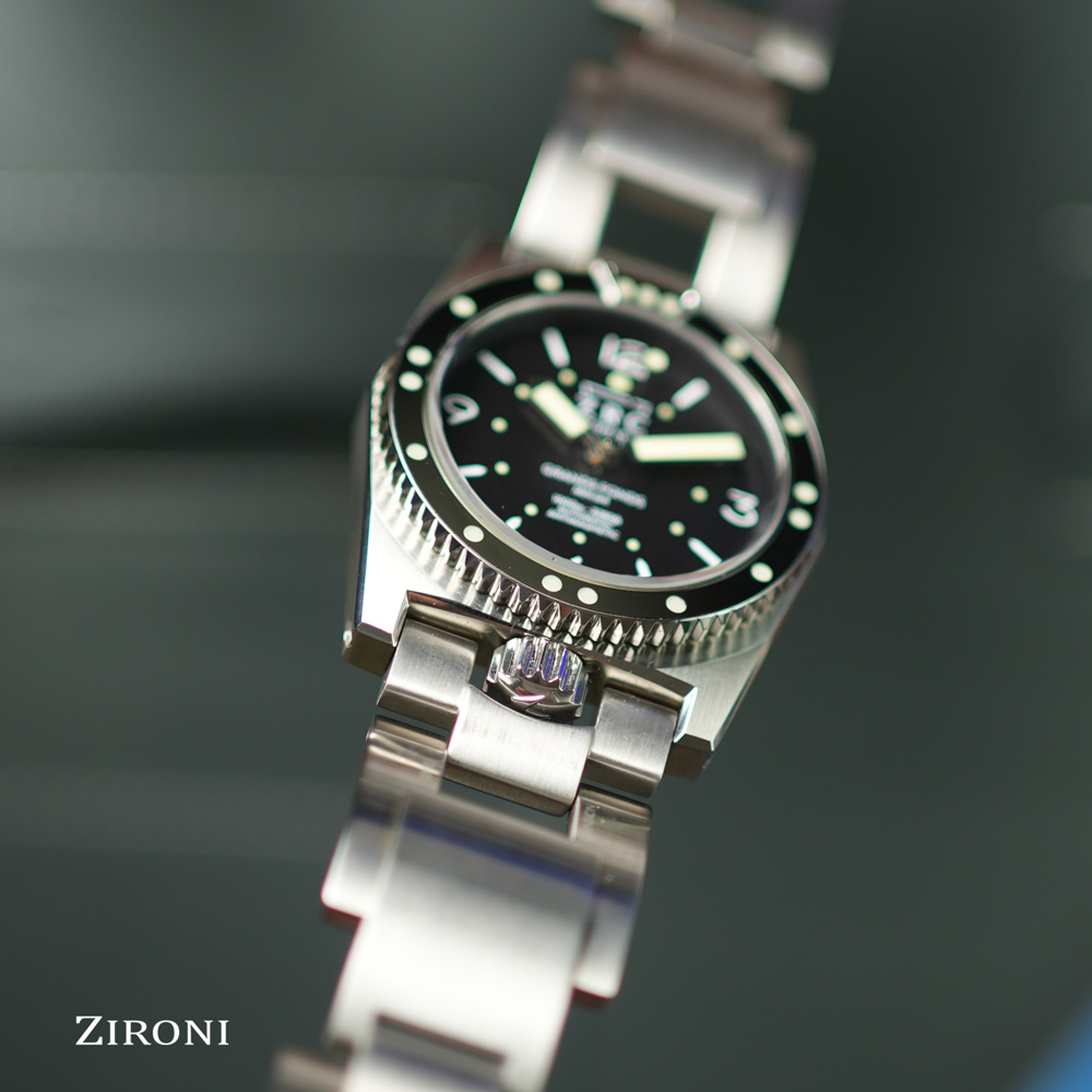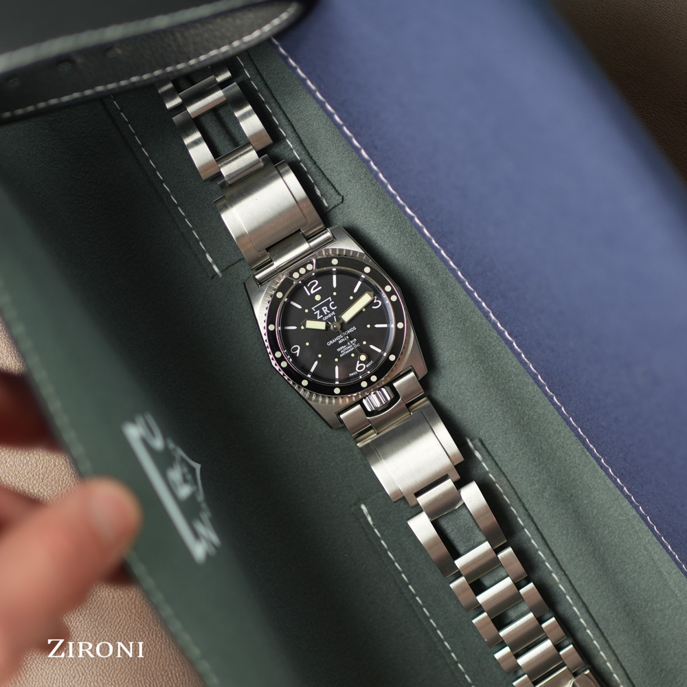 Con il suo quadrante nero, la cassa in acciaio satinato e il cinturino metallico, questo modello incarna la quintessenza dell’orologio subacqueo ZRC Grands Fonds 300®.