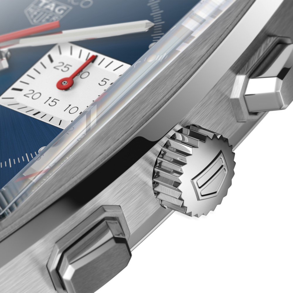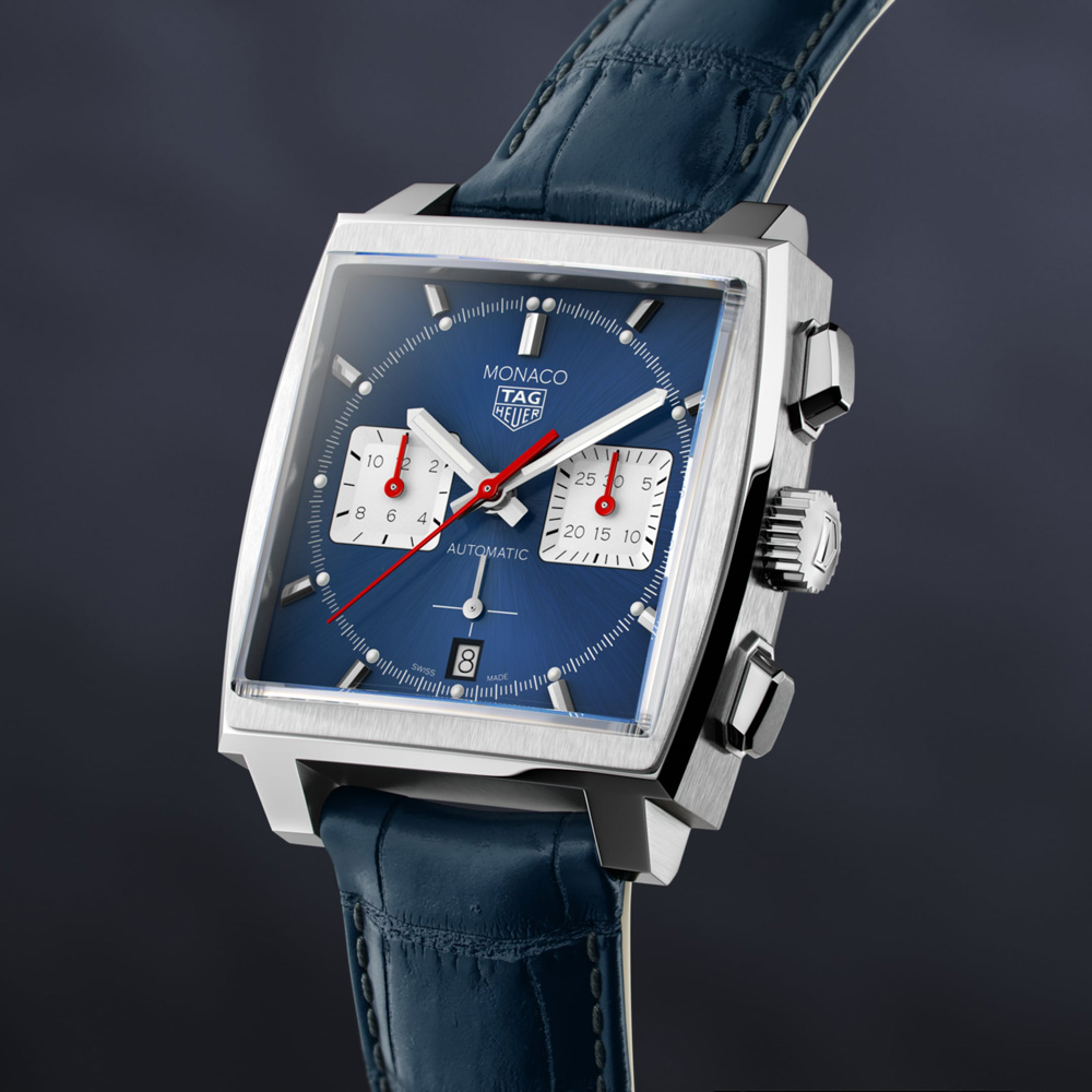 Il primo Monaco dotato del movimento di manifattura Heuer 02. Un design vintage intramontabile fedele al Monaco blu originale e al suo volto quadrato, completato da 80 ore di riserva di carica.
