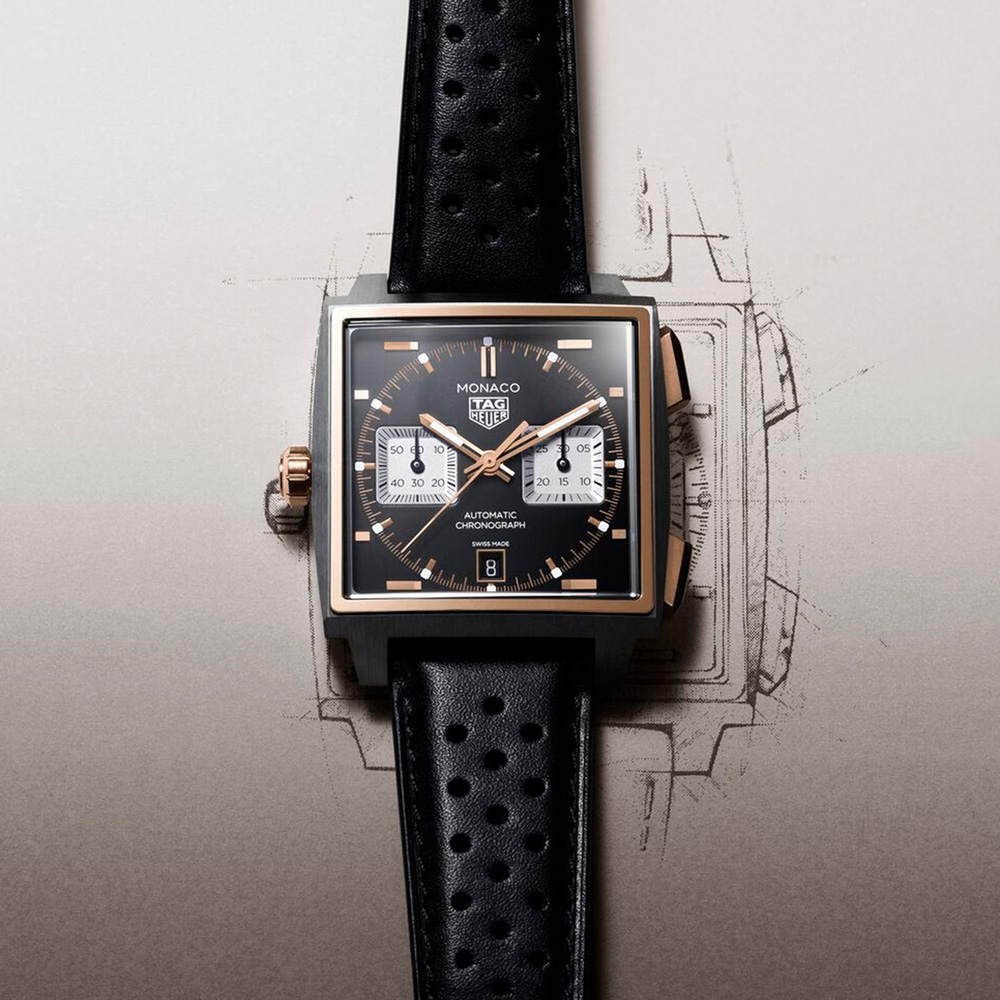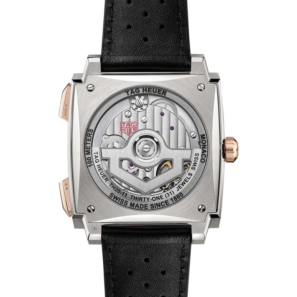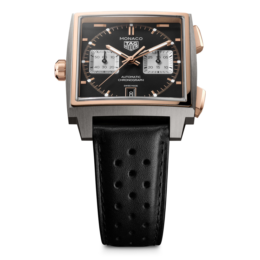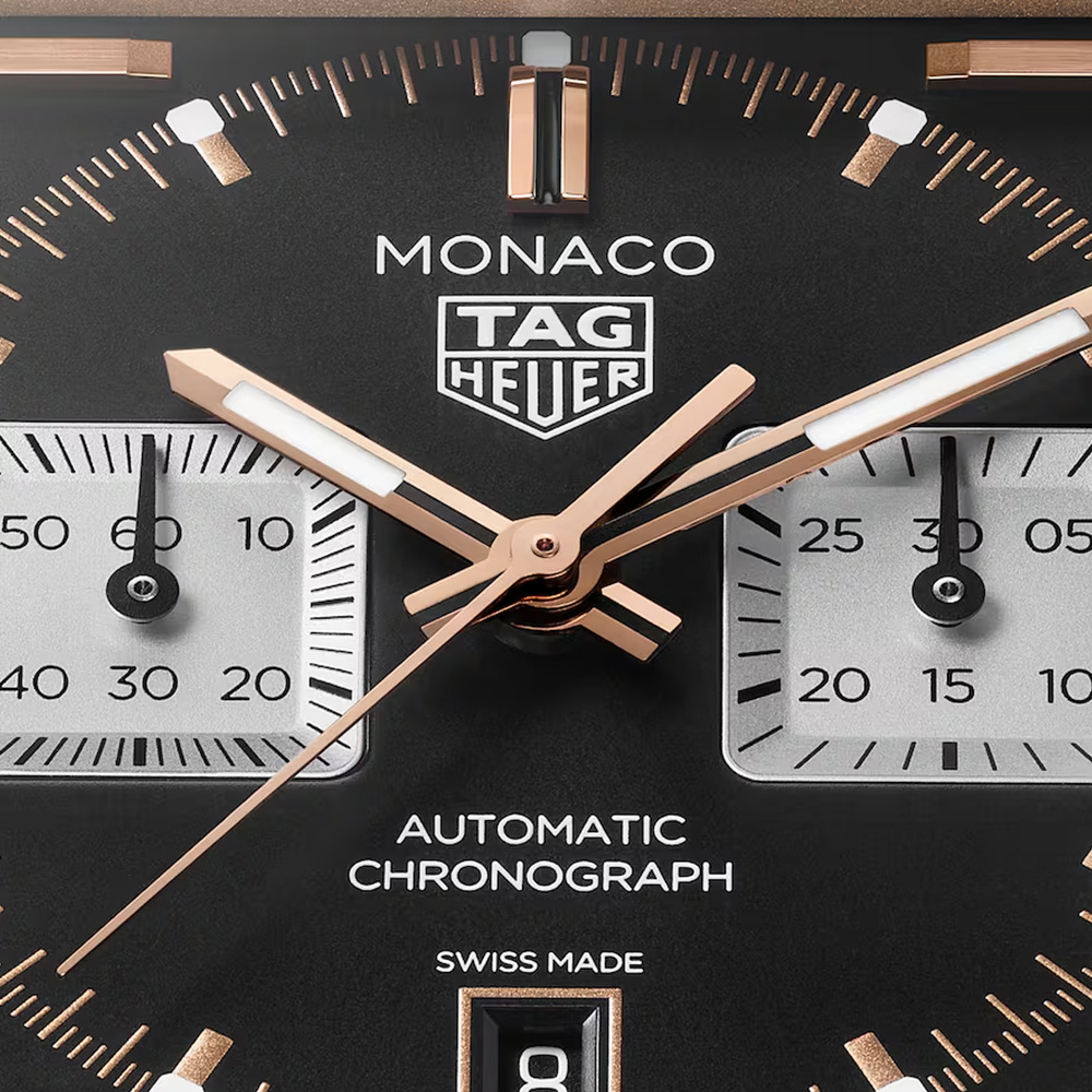Il quadrante nero opalino presenta contatori argentati e lancette e indici placcati oro rosa 18K 5N, completati da Super-LumiNova® bianco per una leggibilità perfetta. Il datario a finestrella smussata a ore 6 dona equilibrio al quadrante, mentre i delicati dettagli dorati sublimano la caratteristica geometria quadrata del TAG Heuer Monaco.