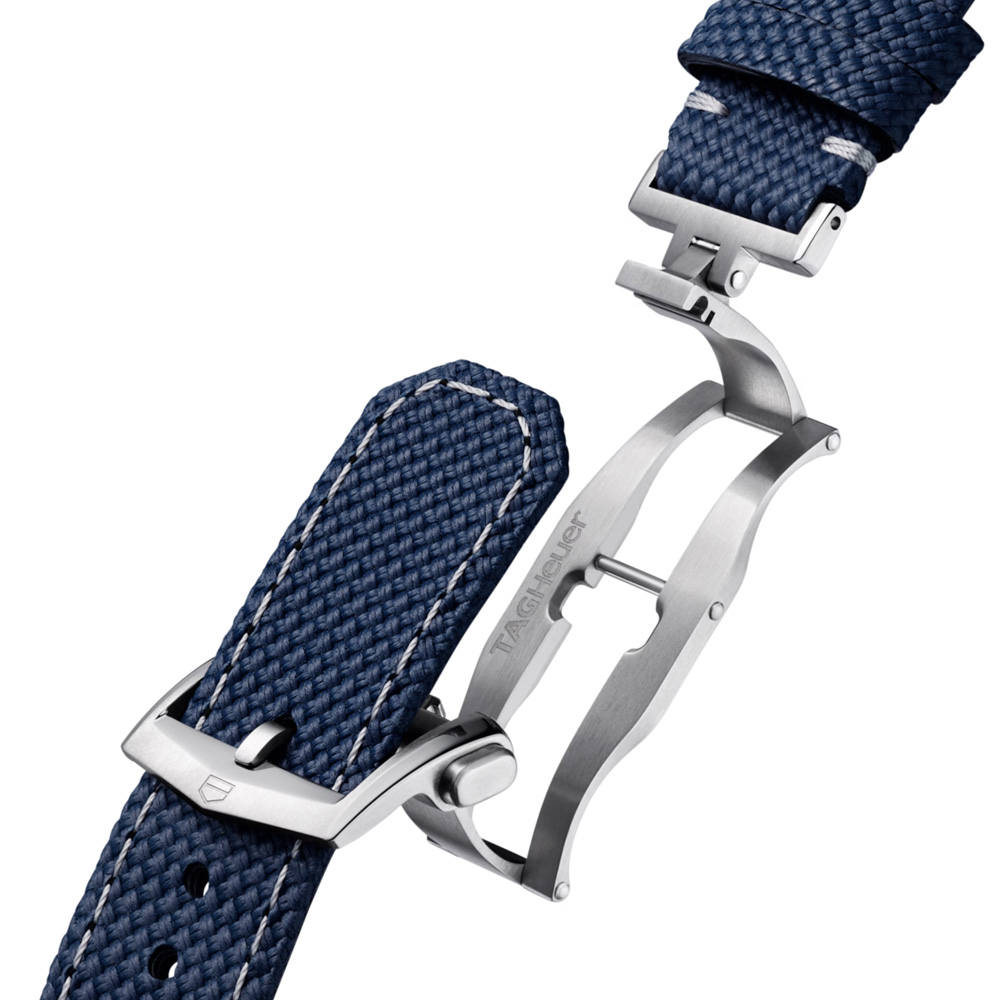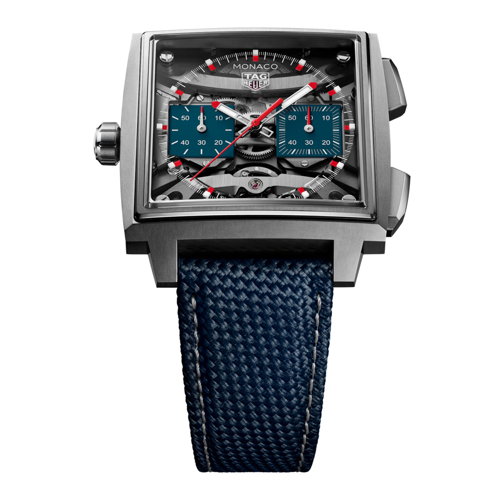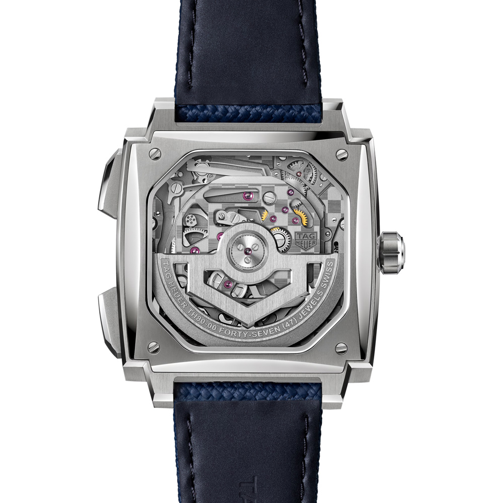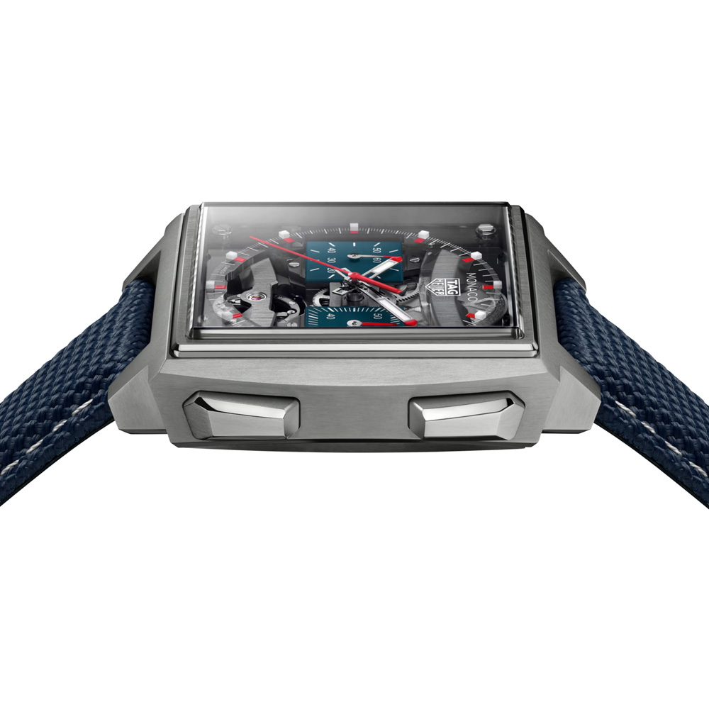 Realizzata in titanio grado 5, la cassa da 40 mm unisce resistenza e leggerezza. Il fondello in vetro zaffiro rivela la complessa architettura del calibro quadrato, mentre il cinturino in caucciù blu con goffratura in tessuto e impunture grigie unisce comfort ed eleganza. Questo TAG Heuer Monaco incarna lo spirito d’avanguardia della Maison: innovativo, distintivo e costruito per durare.