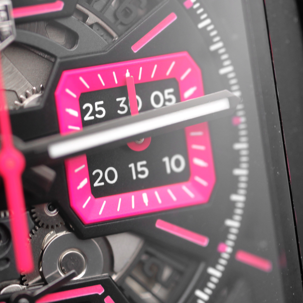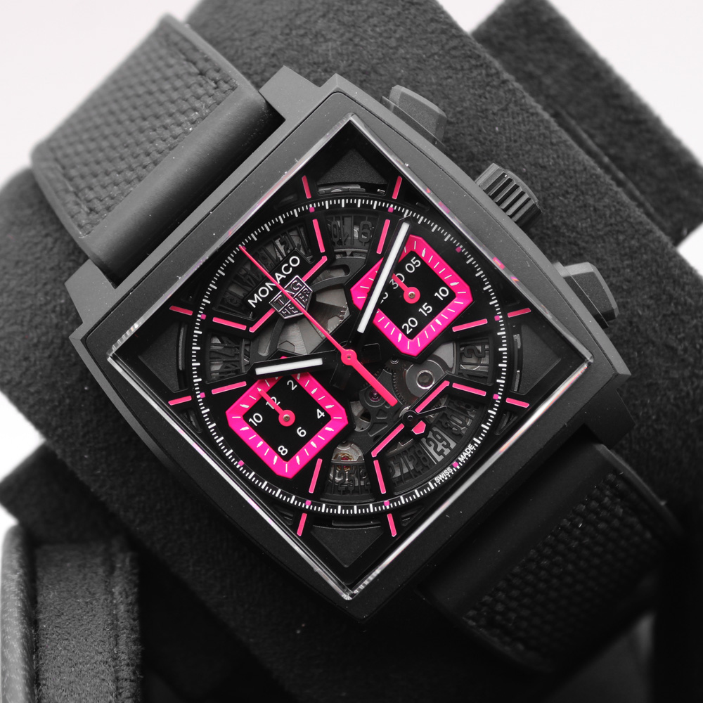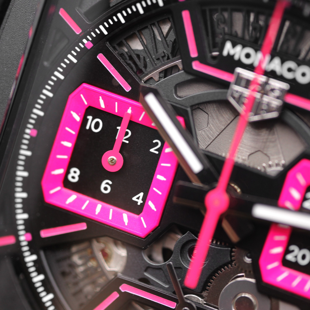 L’energia del rosa. Il nuovo TAG Heuer Monaco Chronograph si distingue per un quadrante scheletrato rosa, un omaggio cromatico che riflette le luci vibranti di Las Vegas.