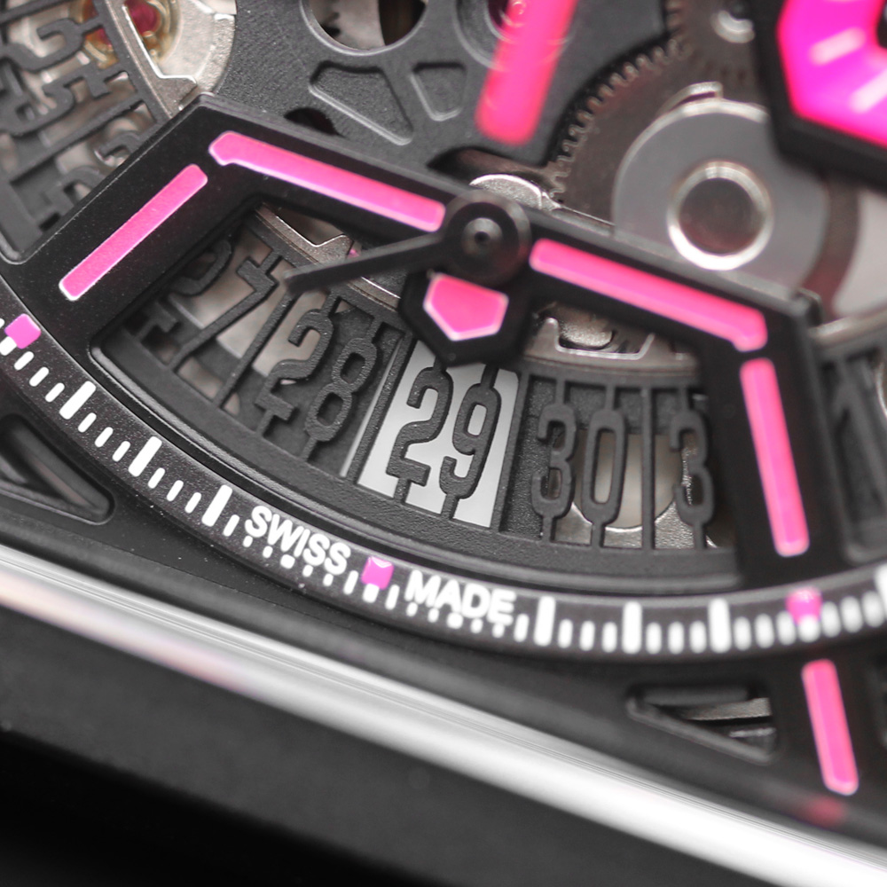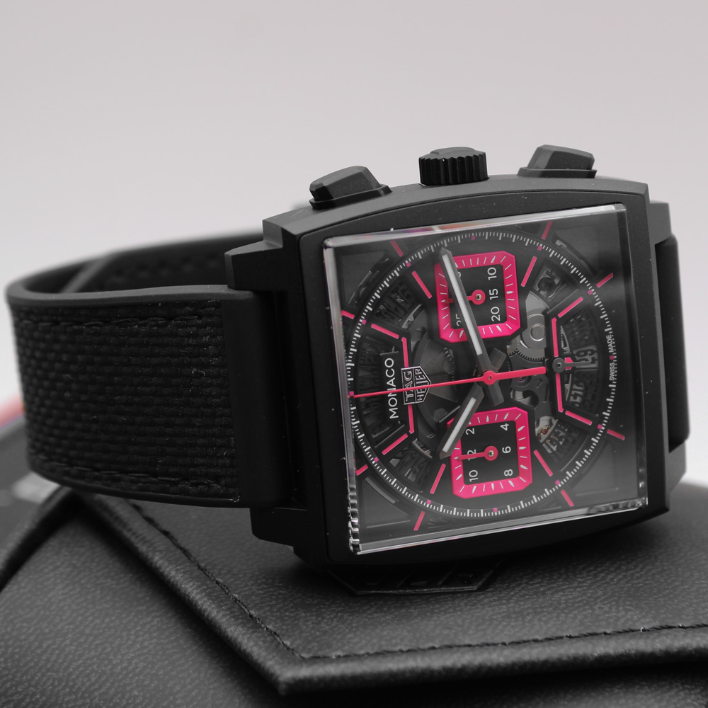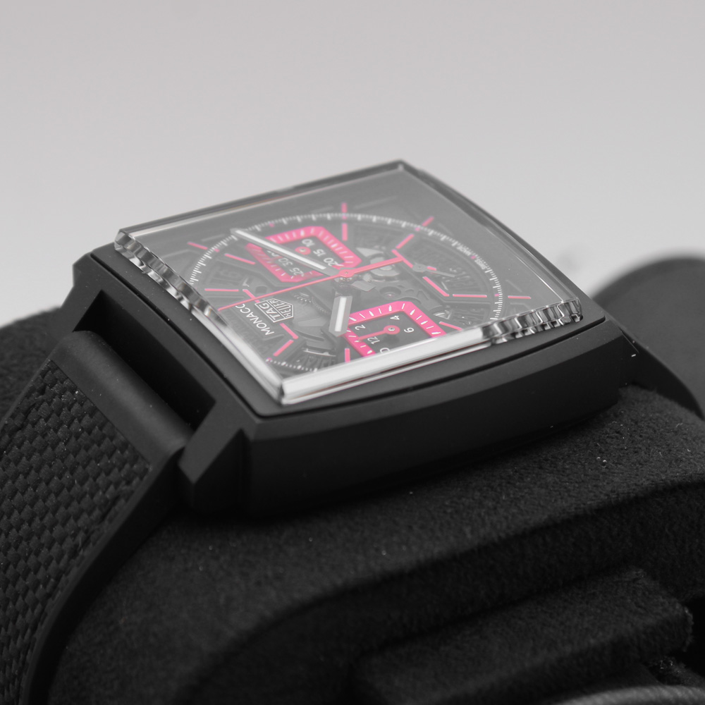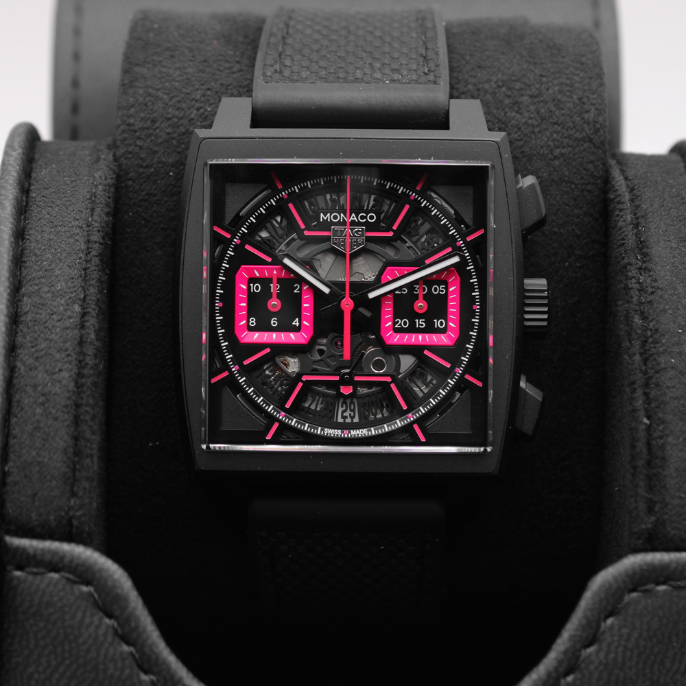 L’energia del rosa. Il nuovo TAG Heuer Monaco Chronograph si distingue per un quadrante scheletrato rosa, un omaggio cromatico che riflette le luci vibranti di Las Vegas.