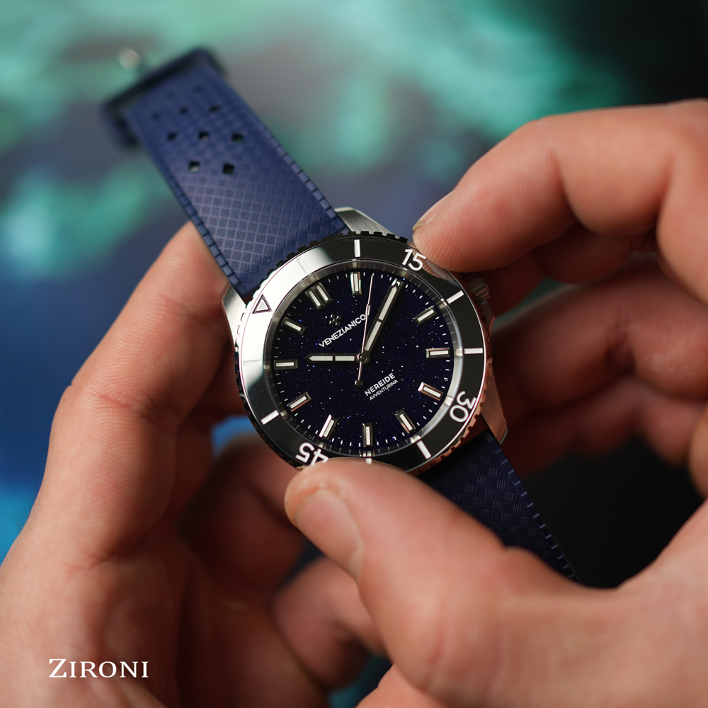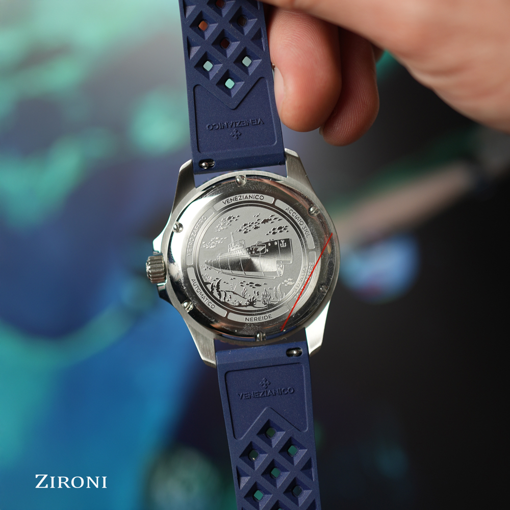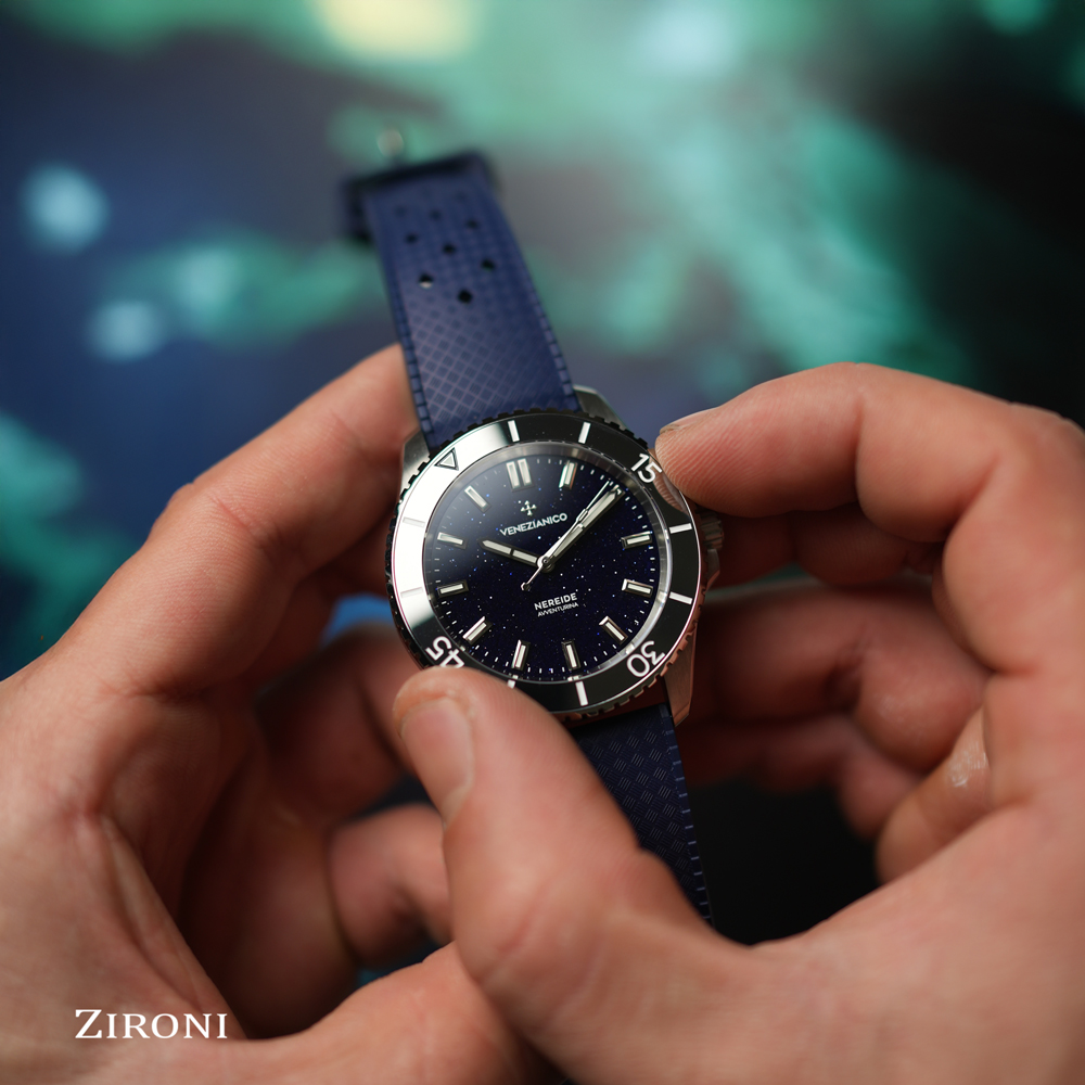 Nereide Avventurina prende il nome dall'omonimo vetro inventato a Venezia nel XVII secolo, caratterizzato da microinclusioni metalliche aghiformi che creano riflessi simili alle stelle del cielo notturno. La lunetta in tungsteno, resistente e inscalfibile, arricchisce la cassa di 10.65mm. L'ergonomia è ottimale grazie alla silhouette compatta e al cinturino Tropic in gomma FKM, che offre comfort in ogni situazione.