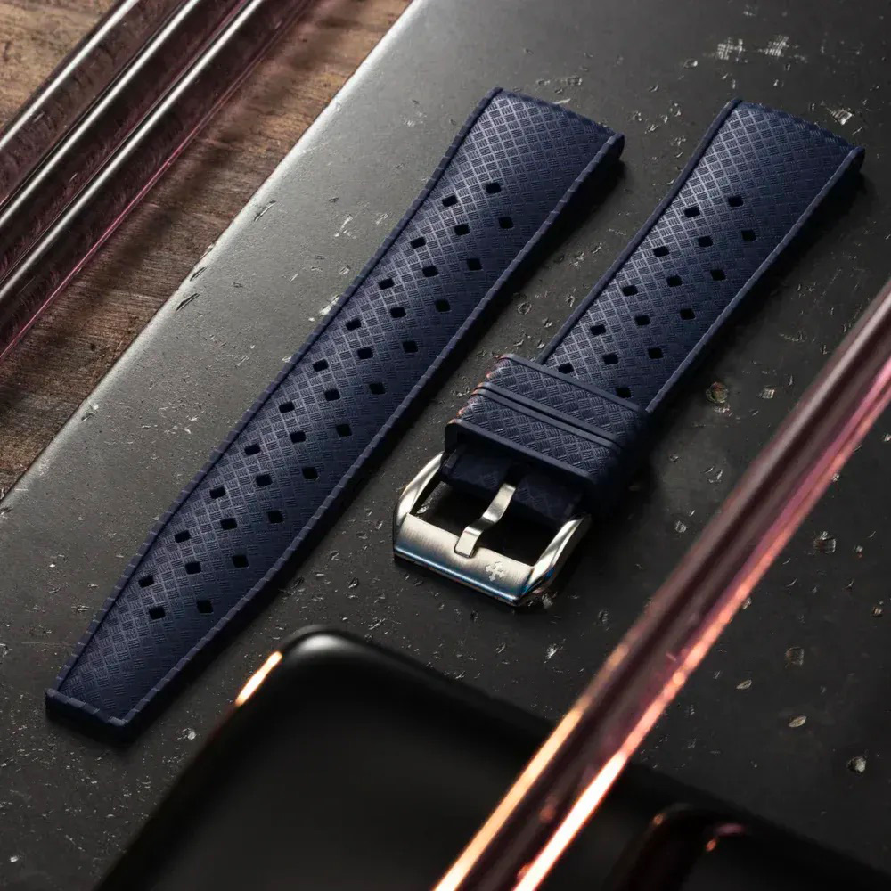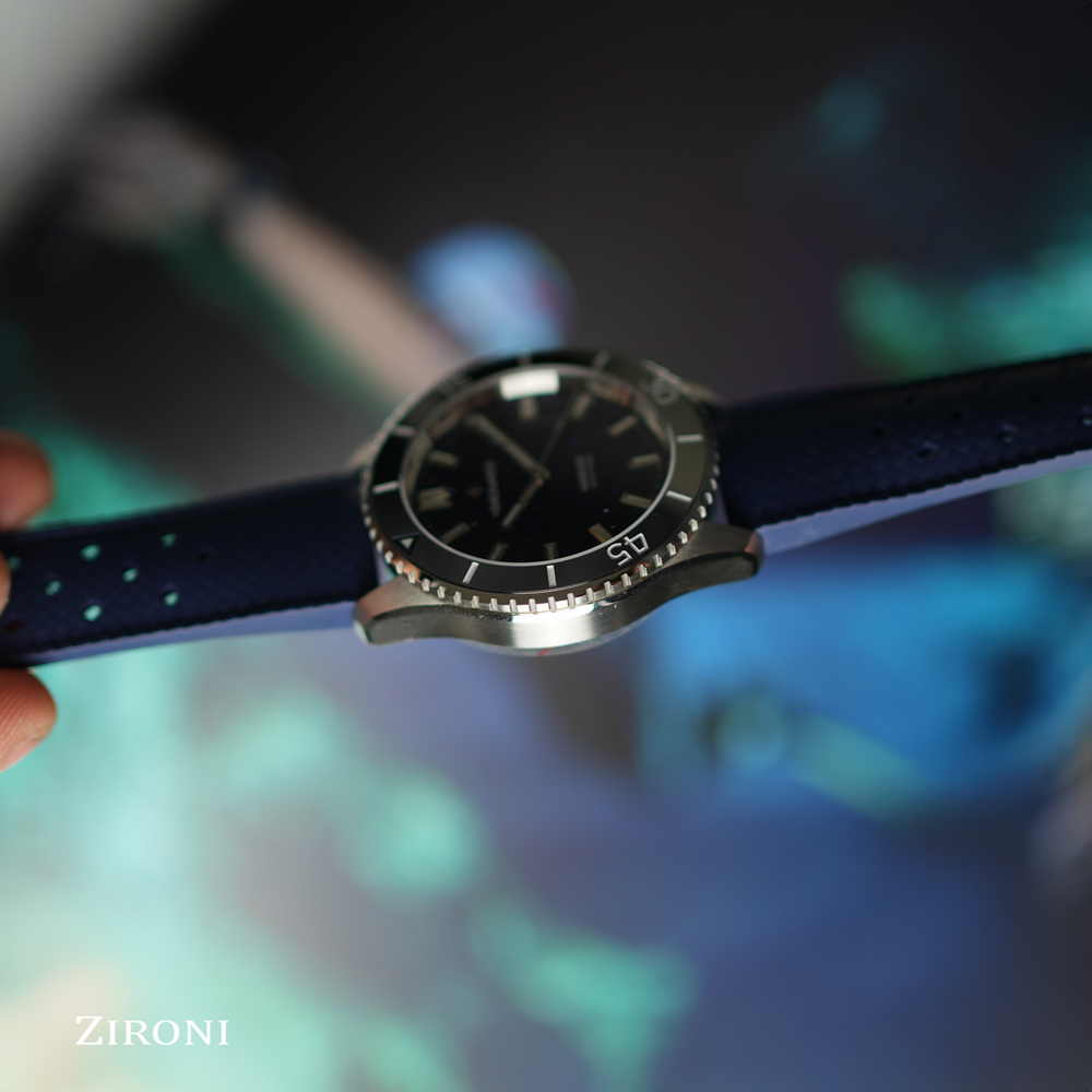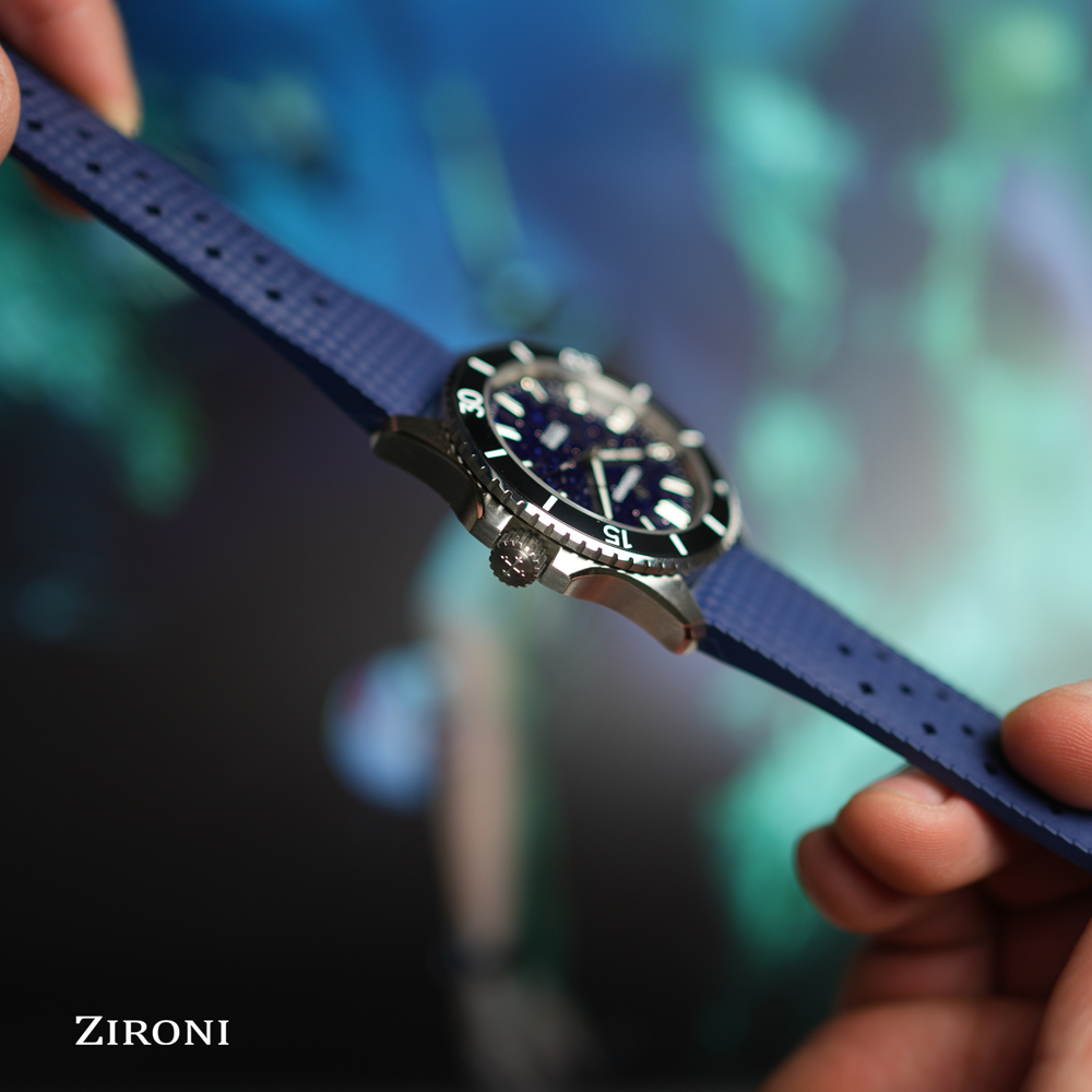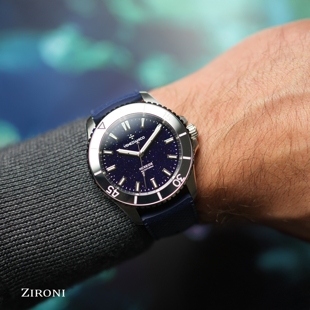 Nereide Avventurina prende il nome dall'omonimo vetro inventato a Venezia nel XVII secolo, caratterizzato da microinclusioni metalliche aghiformi che creano riflessi simili alle stelle del cielo notturno. La lunetta in tungsteno, resistente e inscalfibile, arricchisce la cassa di 10.65mm. L'ergonomia è ottimale grazie alla silhouette compatta e al cinturino Tropic in gomma FKM, che offre comfort in ogni situazione.