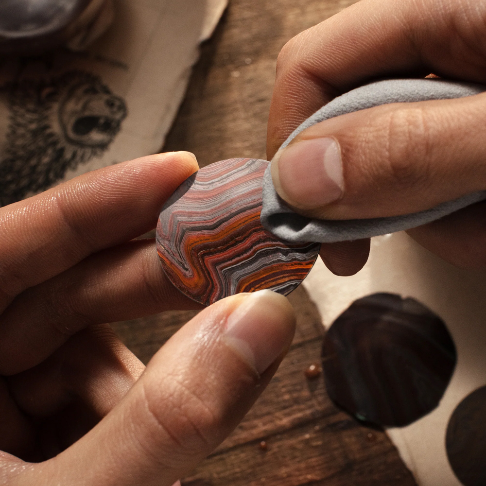 Le stratificazioni della pietra emergono dall’unione di occhio di tigre, diaspro rosso ed ematite, tre componenti minerali differenti per struttura e comportamento. La loro combinazione genera una superficie naturale imprevedibile, in cui rosso intenso, venature scure e riflessi metallici si distribuiscono in modo sempre diverso. Ogni quadrante è unico, determinato dalla composizione stessa del materiale, ed è proprio questa unione di elementi eterogenei a dare origine al nome Chimera.