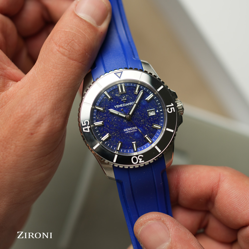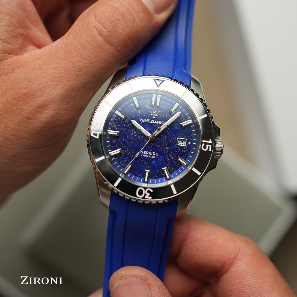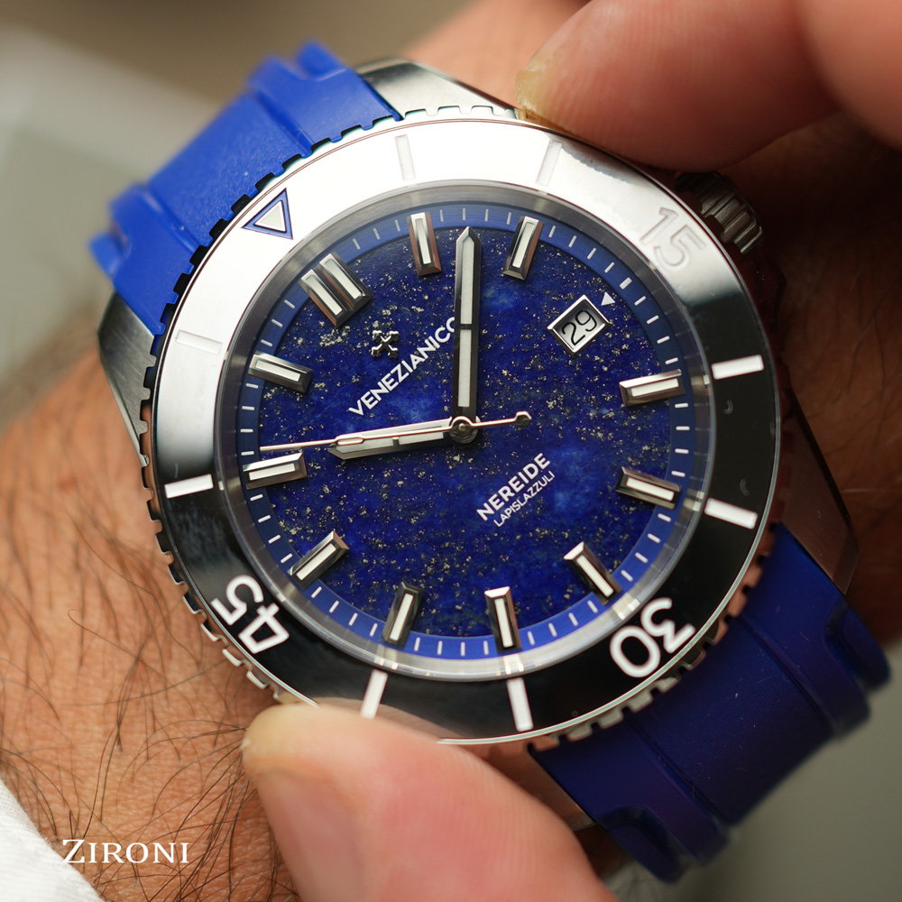 Nereide Lapislazzuli combina la tradizione veneziana con materiali di eccezionale valore. Il quadrante in lapislazzuli, noto per il suo blu intenso e simbolo di nobiltà, porta con sé una storia millenaria. La cassa robusta e la lunetta in tungsteno aggiungono resistenza e durabilità, creando un equilibrio perfetto tra arte antica e innovazione.