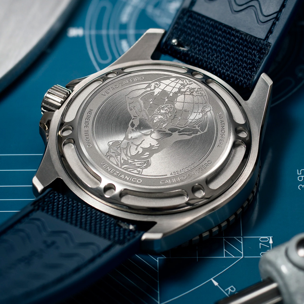 Il Nereide Titanio, ispirato alla statua di Atlante nel cortile di Palazzo Ducale, celebra la leggerezza e la resistenza di questo straordinario materiale. Il nome stesso richiama i Titani della mitologia greca, figure di forza e potenza, incarnate perfettamente da Atlante, simbolo di resilienza e maestosità. La cassa, rifinita con precisione, unisce prestazioni tecniche e raffinatezza estetica, rendendo questo orologio un omaggio al mito e alla modernità.