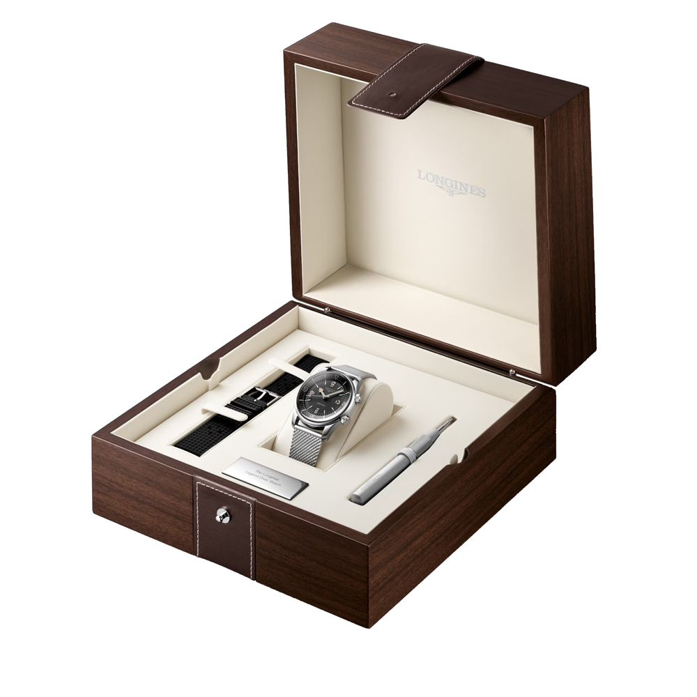 A prima vista, si distingue per le due corone e la lunetta girevole interna. Inventata da Longines, la posizione della lunetta all’interno della cassa la protegge da manipolazioni e urti accidentali che potrebbero alterarne le impostazioni.