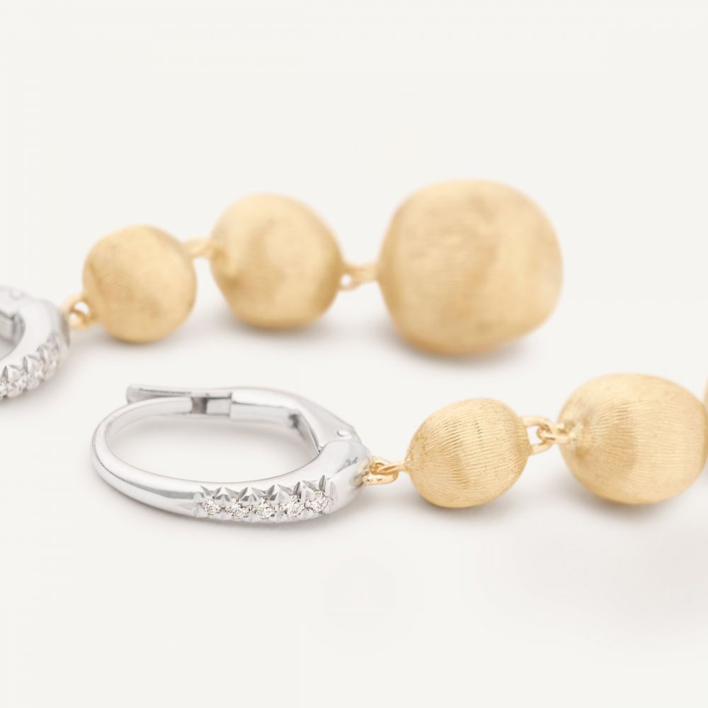 Classico intramontabile, ma seducente e audace al contempo, quest’orecchino in oro giallo 18kt, finemente inciso a mano con l'antica tecnica del bulino millerighe, è impreziosito da un amo di diamanti taglio brillante che dona lucentezza ed eleganza.