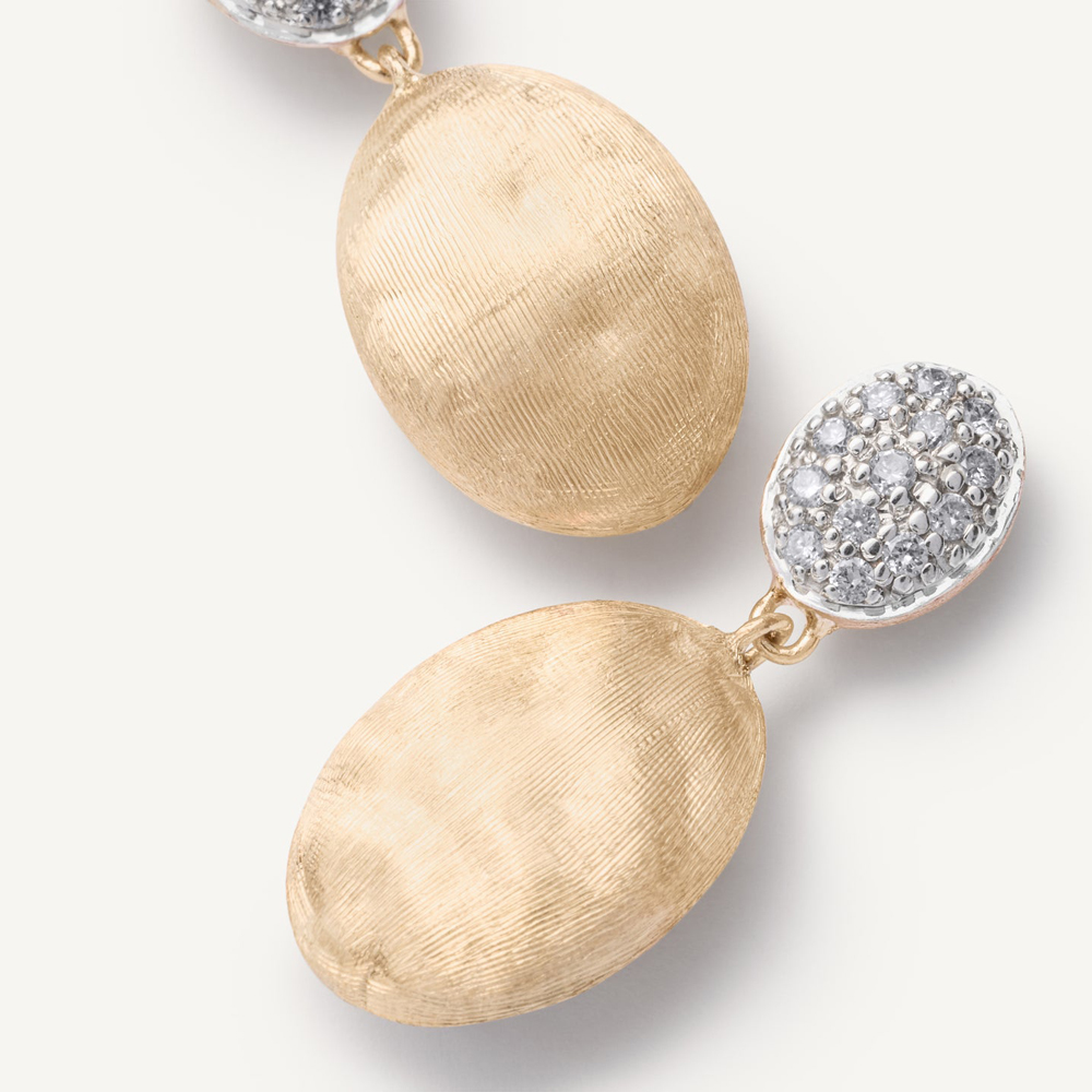 Delicato e senza tempo, questo orecchino in oro giallo 18kt, finemente inciso a mano con l'antica tecnica del bulino millerighe, è composto da due piccoli ovali, impreziositi da un elegante pavé di diamanti taglio brillante.