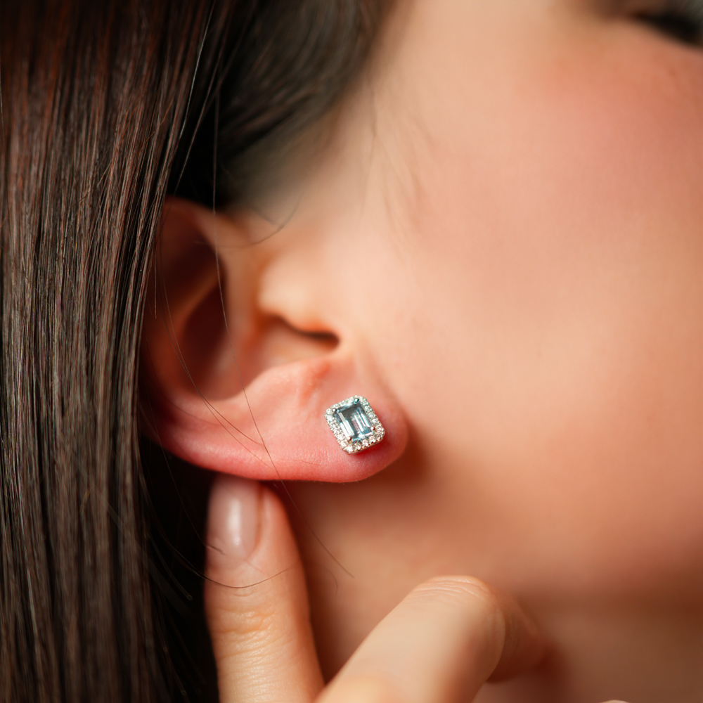 Orecchini in oro bianco 18K con acquamarina taglio smeraldo (1,15 ct) e contorno di diamanti taglio brillante (0,20 ct - G - SI)
