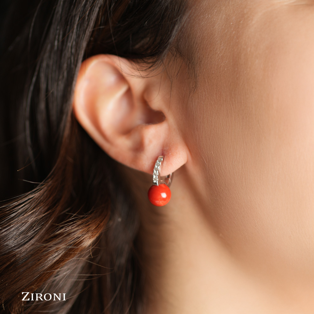 Orecchini in oro bianco 18K con diamanti taglio brillante (ct 0,26) e corallo (mm 9,00)
