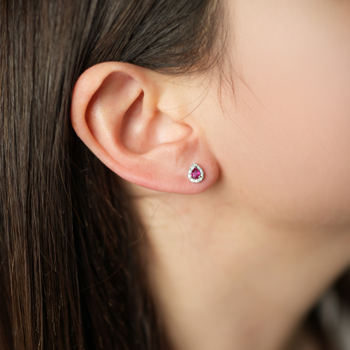 Orecchini in oro bianco 18K con 2 rubini taglio goccia (0,37 ct) e contorno di diamanti taglio brillante (0,08 ct - G/H - SI)