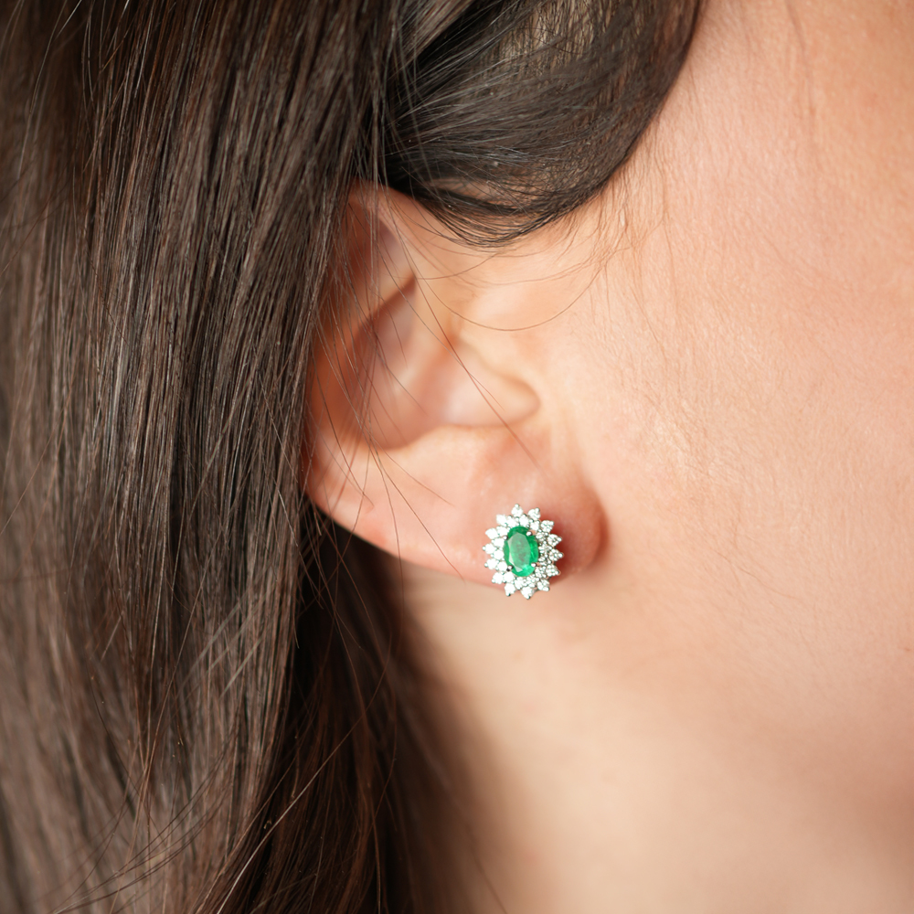 Orecchini in oro bianco 18K con smeraldi taglio ovale (0,88 ct) e contorno di diamanti (0,56 ct - G/H - SI)