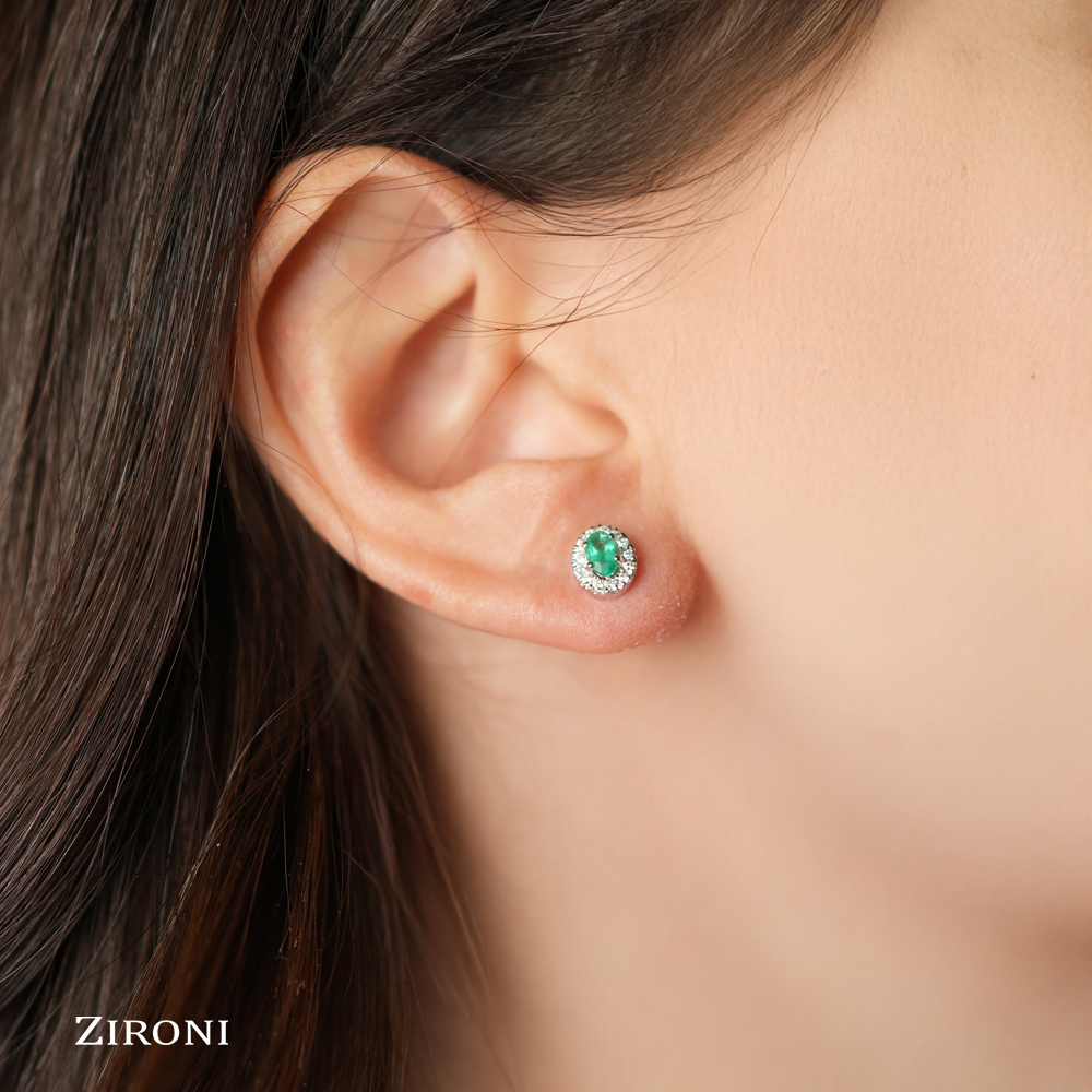 Orecchini in oro bianco con smeraldi taglio ovale (ct 0,46) e contorno di diamanti taglio brillante (ct 0,18 - G/H - SI)