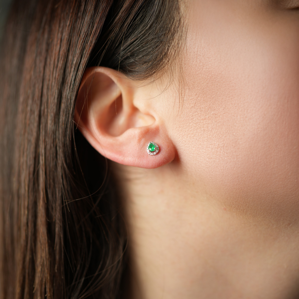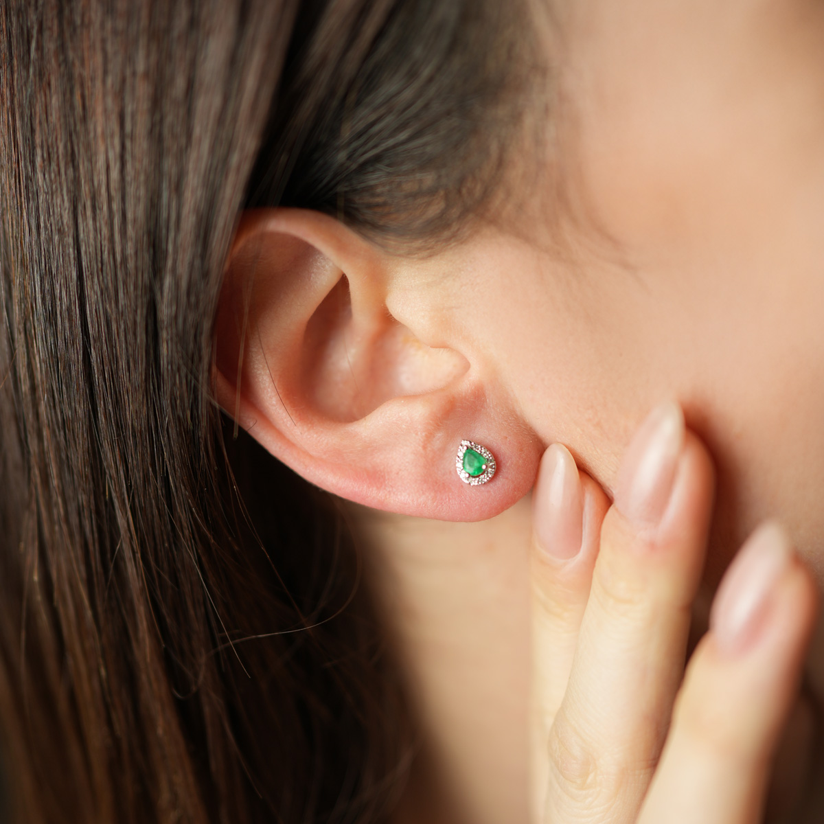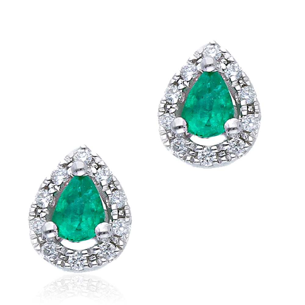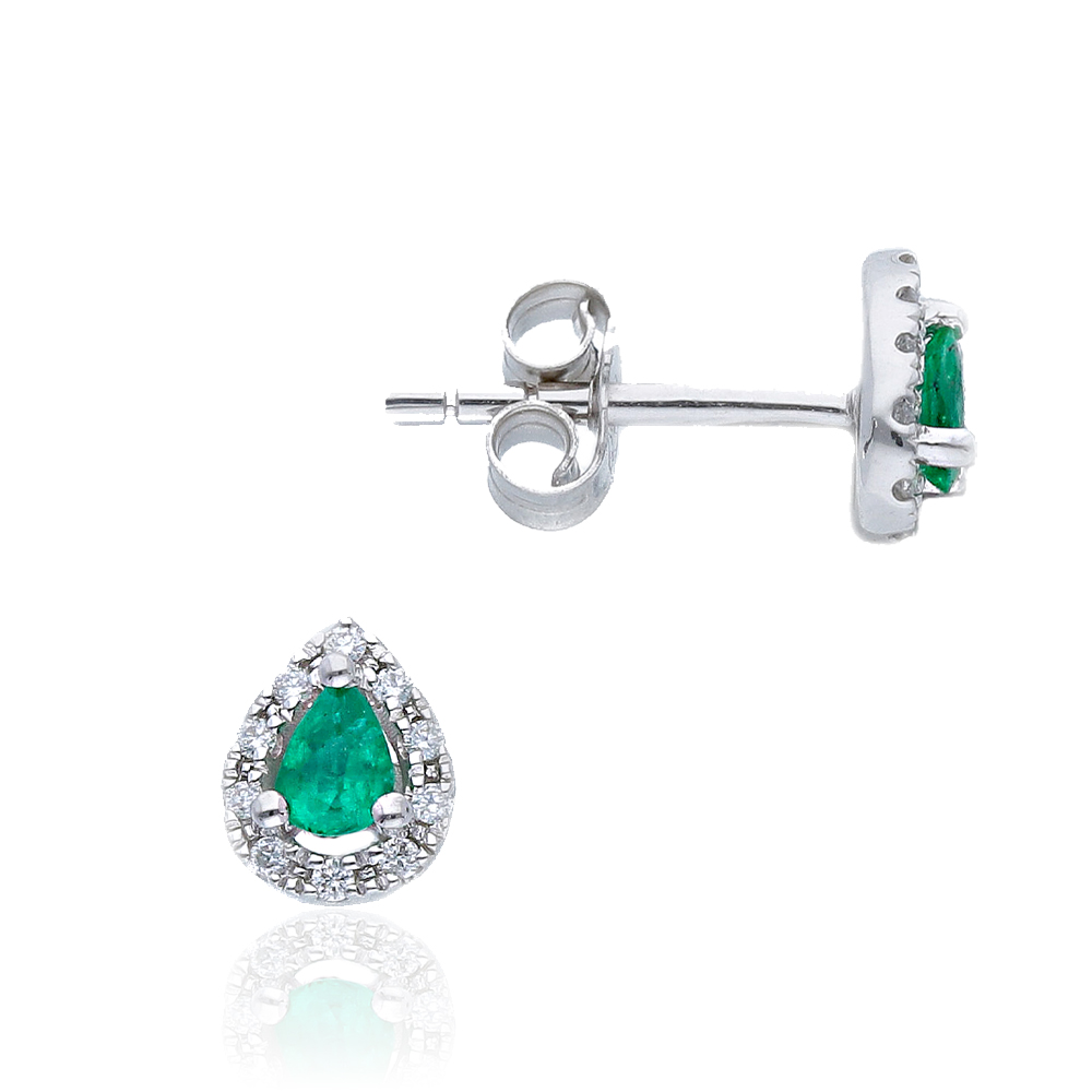 Orecchini in oro bianco 18K con smeraldi taglio goccia (0,26 ct) e contorno di diamanti taglio brillante (0,08 ct - G/H - SI)