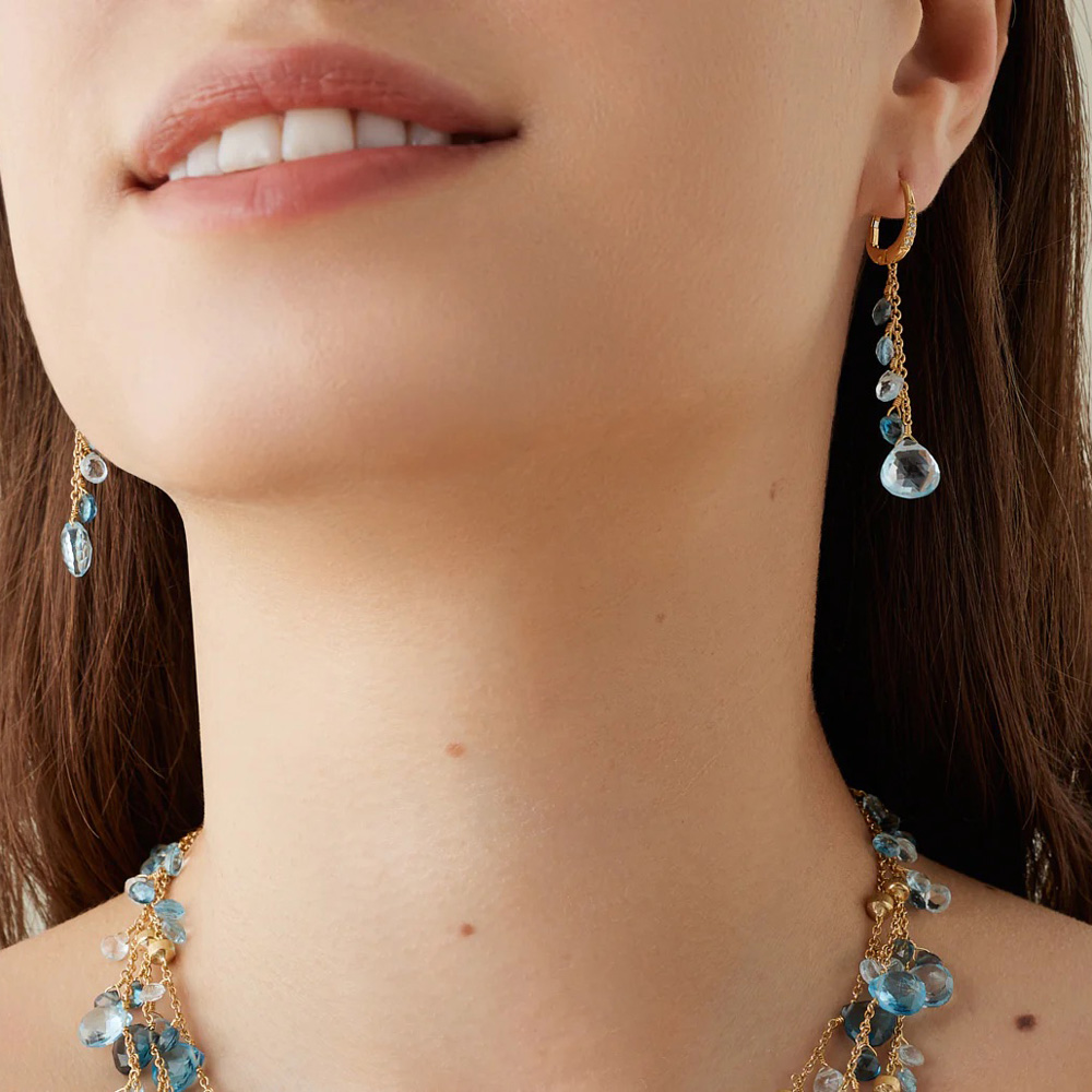 Questo orecchino pendente in oro giallo 18 carati è impreziosito da topazi in diverse sfumature di blu e dal caratteristico taglio a cuore. Un delicato pavé di diamanti impreziosisce il lato anteriore della chiusura.