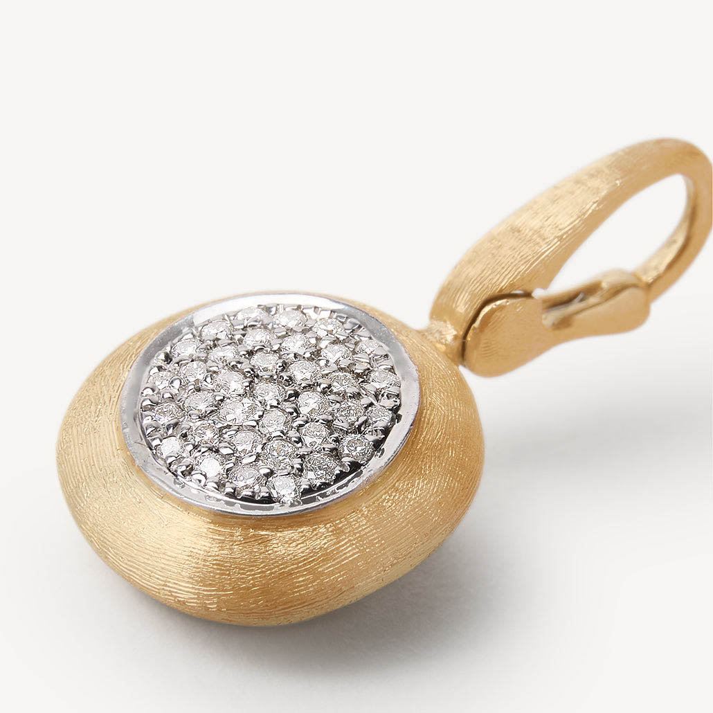 Un elegante pavé di diamanti taglio brillante impreziosisce al centro questo pendente, conferendogli un design sofisticato. In oro giallo 18kt, è finemente inciso a mano con l’antica tecnica del bulino millerighe.