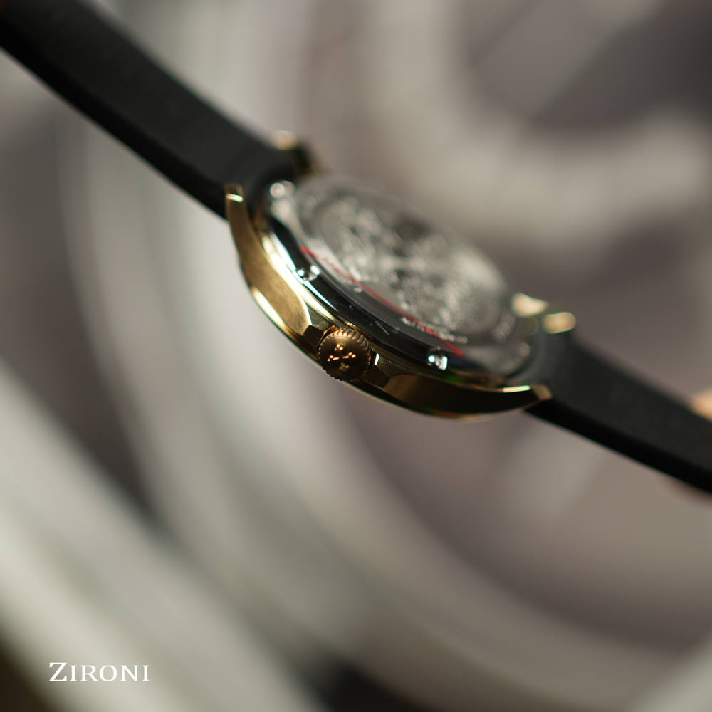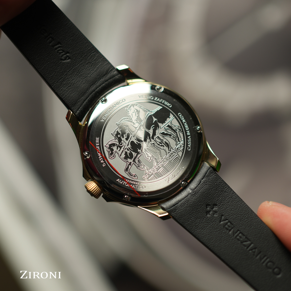 Ispirato ai leggendari Cavalli di San Marco, il Redentore Bronzo celebra l'arte e la tradizione veneziana attraverso la lavorazione artigianale di un materiale intriso di storia. Il quadrante artigianale presenta una finitura anticata che ne esalta il carattere, mentre il cinturino in pelle italiana, con la sua superficie spazzolata, riecheggia l'estetica strutturata del bronzo, completando l'orologio con uno stile autentico e raffinato.